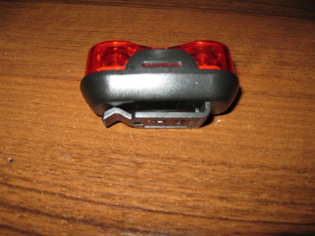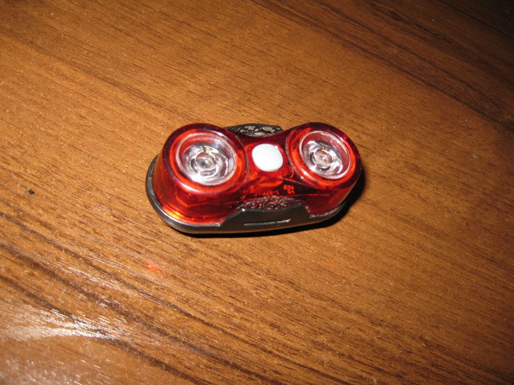 Аналогичная ситуация с желалкой PE4ENbKO — у меня их две сейчас лежат на 2032, на встроенном аккумуляторе подарил одному раздолбаю на ночной покатухе. Очень плохо видна в городском трафике — малая площадь, слабые диоды. Полгода возил на шлеме, пока не купил длинную, пятидиодную, на фотке через одну.