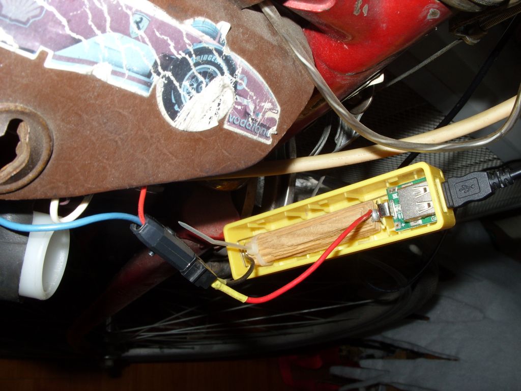 В качестве источника питания использовал аккумулятор типоразмера 18650 разместившийся в бардачке. Продвинутых контроллеров разряда под рукой не оказалось, так что в качестве ограничителя тока взял большой проволочный резистор а зарядку соорудил из павербанка через отдельно выведенный разъем. Туда же подсоединил и заднюю мигалку.