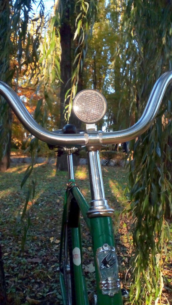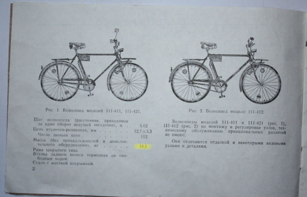 15,5 кг (при том, что велосипед без крыльев, багажника и щитка цепи), что всего на 0,8 кг легче заявленного в инструкции '83 года веса в 16,3 кг. Полагаю в основном вес прибавили неоригинальные педали и резина, даже с учётом того, что седло явно легче оригинального.