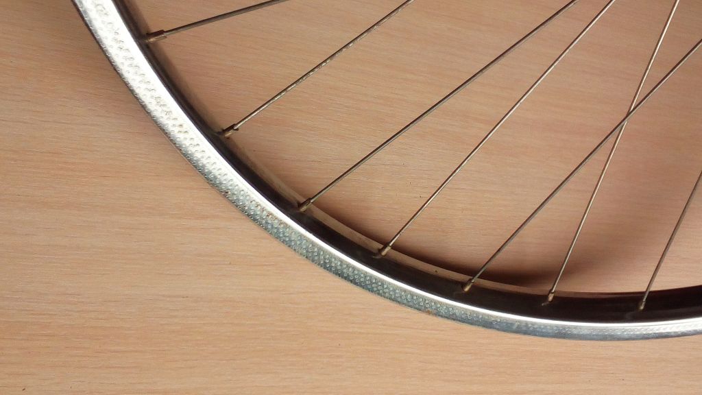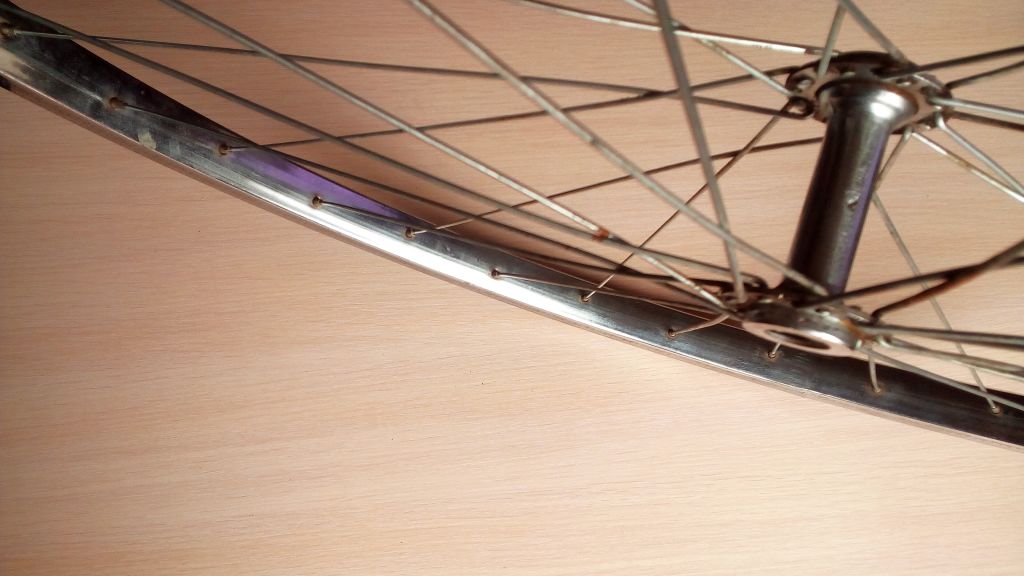 Из ободов живой и более-менее ровный честно говоря только один, который стоял изначально спереди. Задний изрядно потрёпан жизнью, битый/мятый, кривой со всех сторон. Я его конечно выправил как мог, возможно поленился сделать лучше, ну уж как есть, поездит ещё, поставил его спереди.