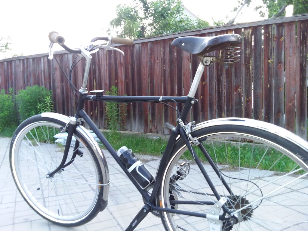В результате ужи были скрещены с ежами. Диамантовский каркас разобрал, выпрямил погнутые планки, развернул пружины, чтобы ровно стояли, собрал взад и натянул туда покрышку с нового седла. Пересверлив дырки для передних зацепов.