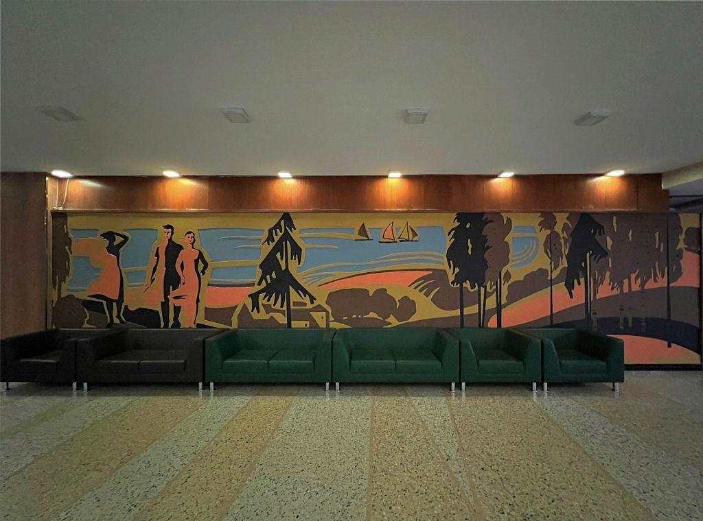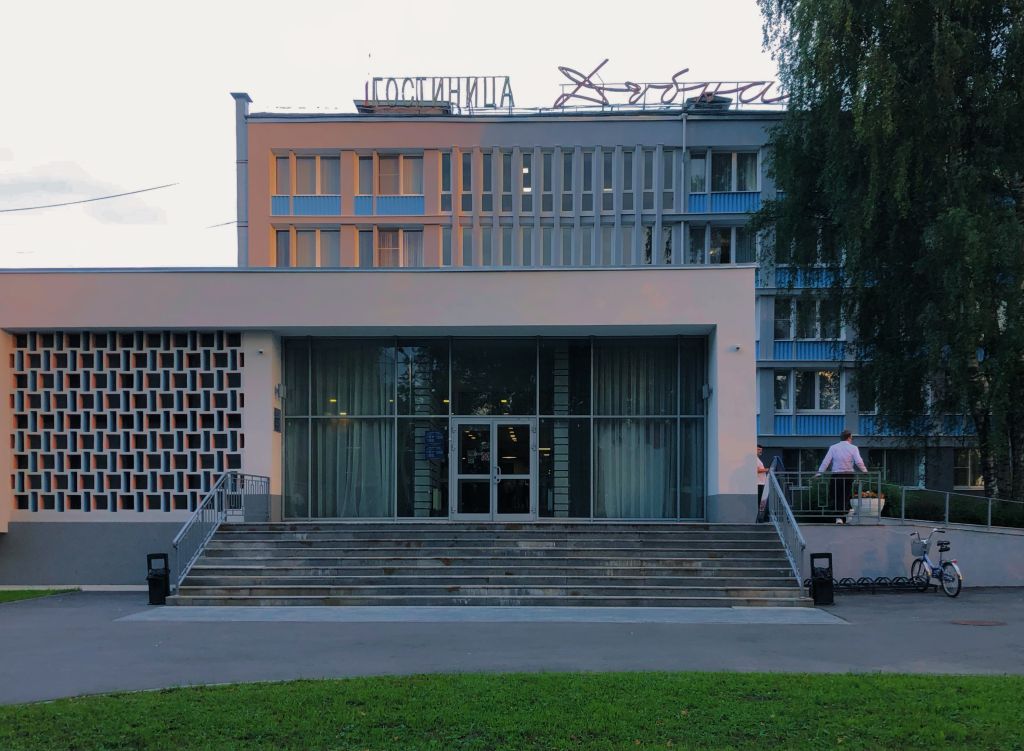 Последние два километра через город, и вот конечная точка — прекрасная академическая гостиница «Дубна», выстроенная в 1963—1964 по болгарскому проекту, со всей присущей этому времени воздушностью фасада и роскошью графики вывесок. В вестибюле сохранилось оригинальное панно, посвящённое досугу дубнинской молодёжи.