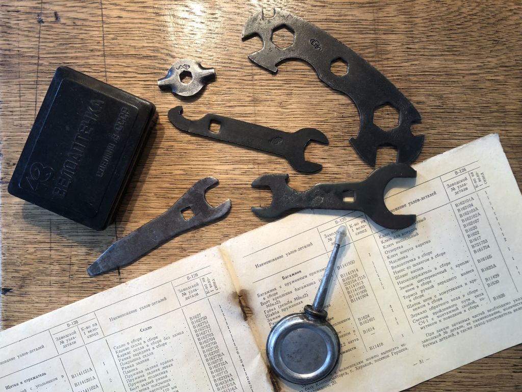 Конечно, конусный ключ трачен, клеймо еле видно. Также подозреваю, что отвёртка мотоциклетная. Но всё же комплект более или менее собран.