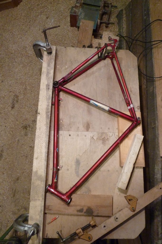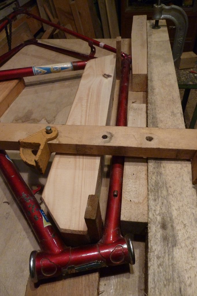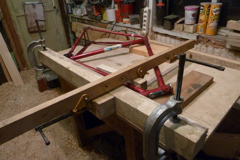 Бонжур. Если кто помнит, то в феврале я обещал не ломать более рамы на нагрузочном стенде, а подлечивать их впредь! Гнутых рам собралось 4 штуки и я решил подойти основательно к делу,  сварганив стапель. Уложив раму в него и, выставив нужный угол с помощью клиньев, можно выгибать повреждения под разными углами относительно плоскости рамы. Опора на брус осуществляется только узлами, если надо выгибать наружу трубу, а если выгибать внутрь, то давление осуществляется малым брусом на узлы, а горб упирается в  брус -опору. Нагрузка всегда даётся большой переставной струбциной вдоль плоскости стапеля. Дело пошло. ВЫПРАВЛЯЮ!!!Азбука кроковода. Контроль і правка геометрії фреймсета Азбука кроковода. Контроль і правка геометрії фреймсета Азбука кроковода. Контроль і правка геометрії фреймсета Азбука кроковода. Контроль і правка геометрії фреймсета