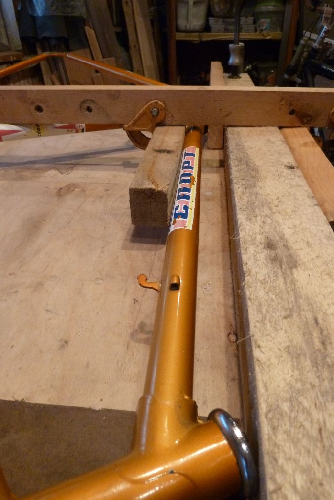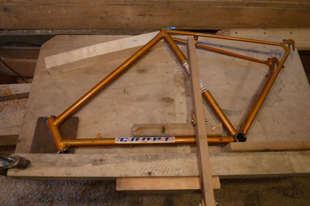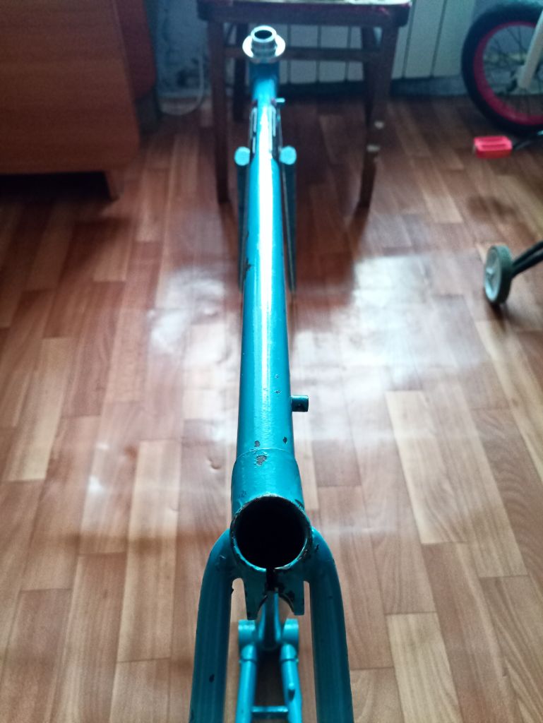На раме был выправлен задний треугольник (был уведен вправо), сведены задние перья до 112 мм (будет торпедный аппарат ). От ниток до подседельной трубы расстояние одинаковое. Визуально пропеллера вроде как нет, однако вилкой пока рано проверять, т.к. она мне голову морочит второй день.