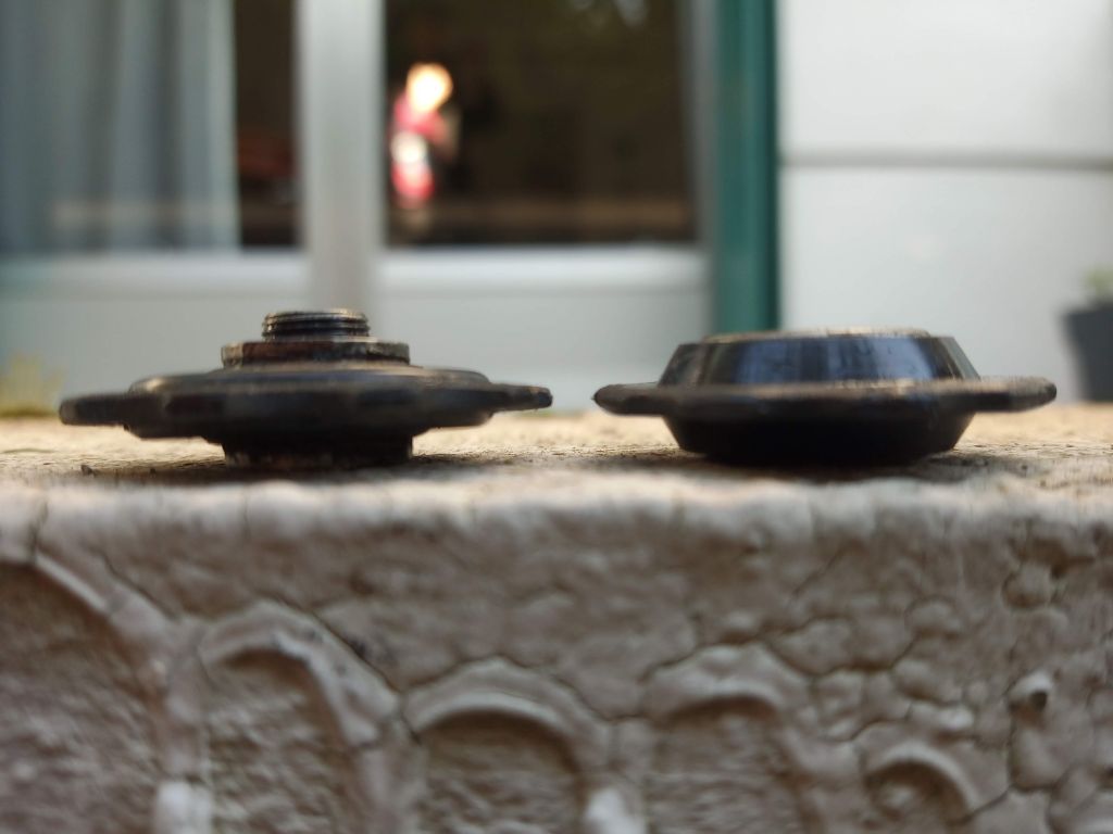 Оказывается, разные: один -- "современный" на подшипнике скольжения, а второй (верхний) -- на регулируемом шариковом подшипнике. Они разной ширины и из-за этого пластины, между которыми они зажаты  (или не знаю как более правильно их назвать), становятся не параллельны друг другу.