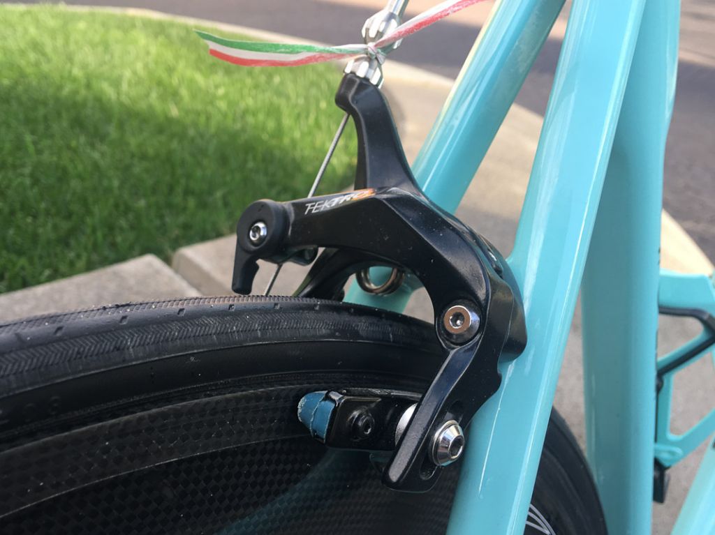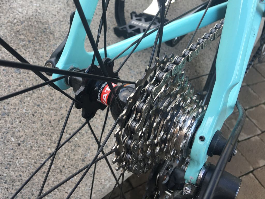 Колеса. Высокие карбоновые обода, узкая резина (20 мм.), аэродинамические спицы. Из опасений пробить резину и повредить край обода на каком-нибудь камешке-гальке или трещине на порядком изношенном асфальте, набил покрышки на рекомендованный максимум — 7,5 атм.