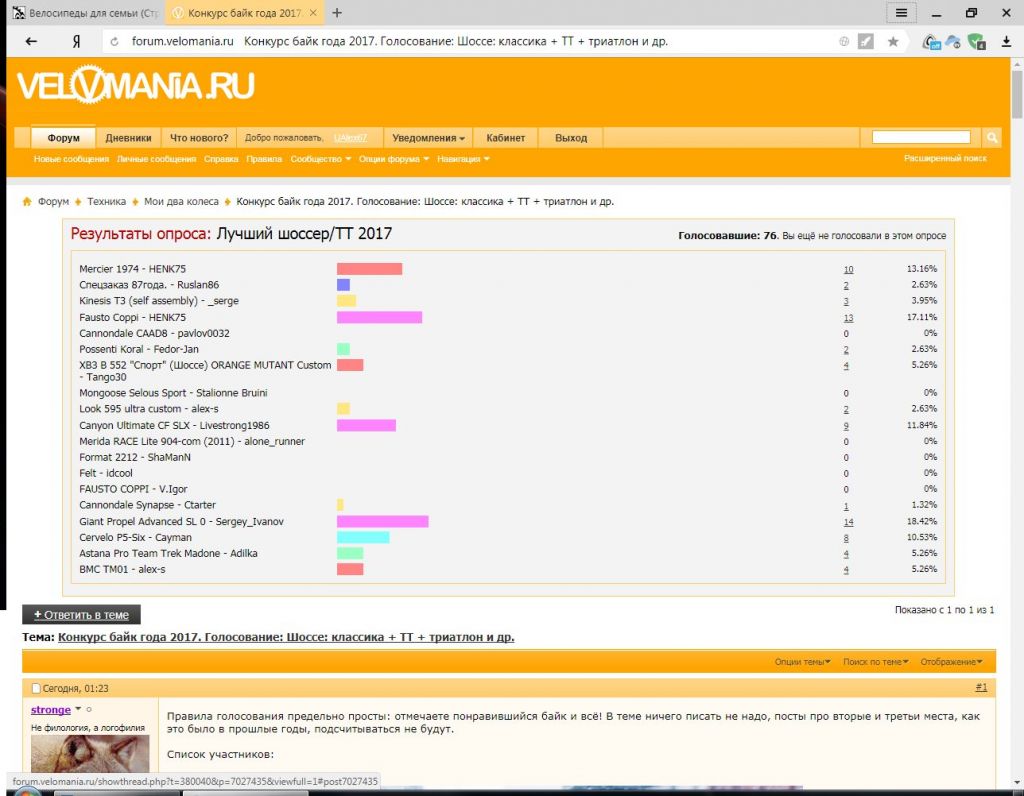 Коллеги, спасибо тем кто уже проголосовал, кто еще хочет проголосовать и зарегистрирован на Веломании больше года можно голосовать вот ссылка http://forum.velomania.ru/forumdisplay.php?f=25 процедура не сложная.