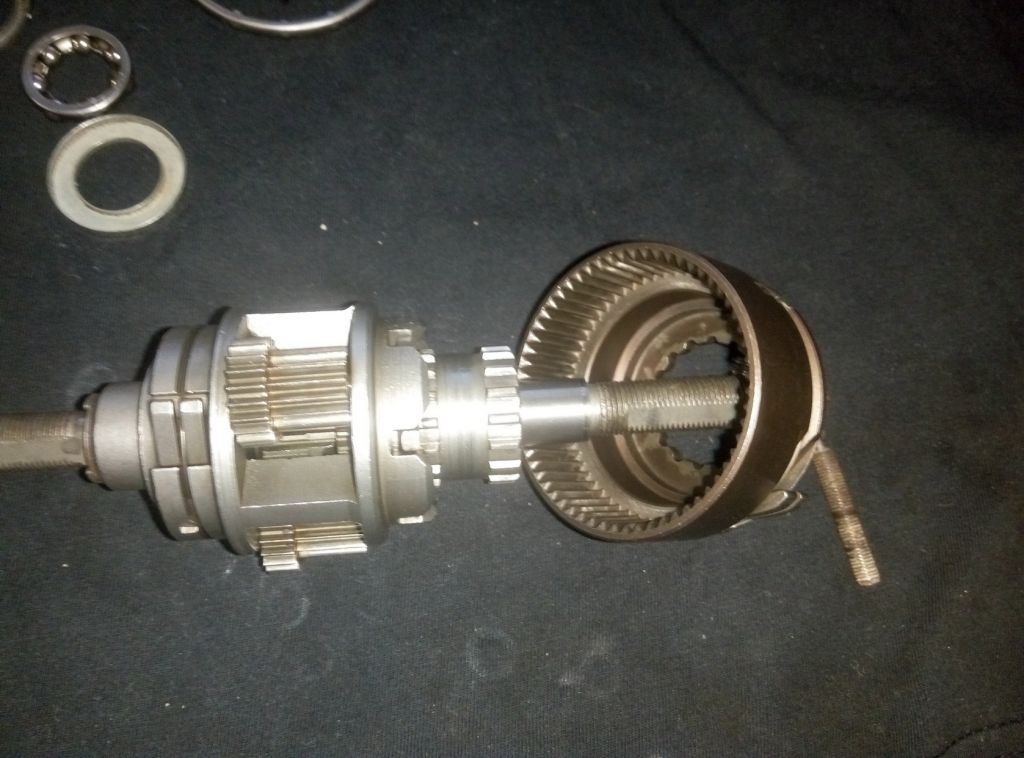 Устанавливаем весь блок с сателитами, нанизываем шайбу с полукругом внутри и стопорим кольцом. Левая часть собрана. Тягу можно выкрутить если мешает.