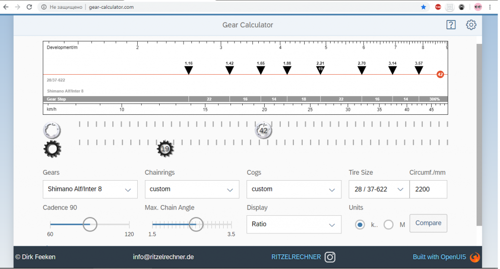 Кстати, 42х19 идеальное соотношение для слабо холмистой местности. Но восьмую передачу только с горы удасться прокрутить.