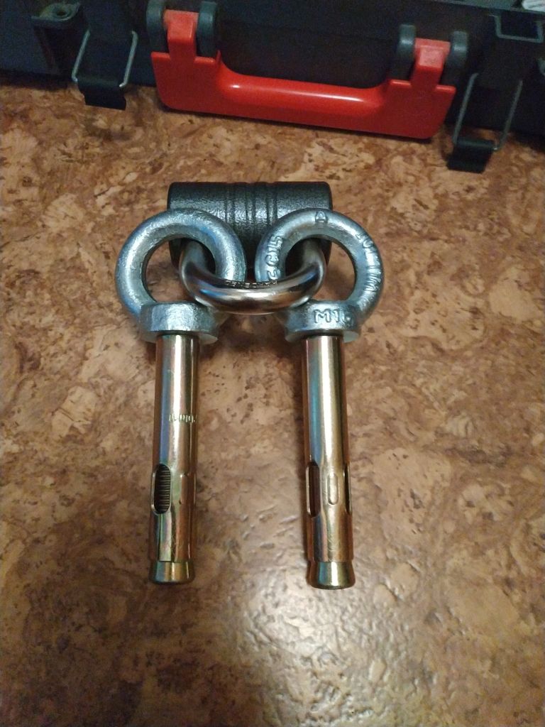 Я сделал паркинг на лестничной запираемой площадке у двери квартиры. Два анкера и рымгайки. Цепь в планах сменить на стропу в термоусадке. Глубина сверления 11 см. Диаметр 20мм. Усилие на вырыв анкера 428 кг, услие на срез 800 кг. Рымгайка м 16 на 700 кг грузоподъемность, 500 кг под углом. Момент затяжки 50. Лом не войдет по диаметру, но по-хорошему надо делать так чтобы анкер торчал больше внутрь гайки для защиты от того самого рычага.