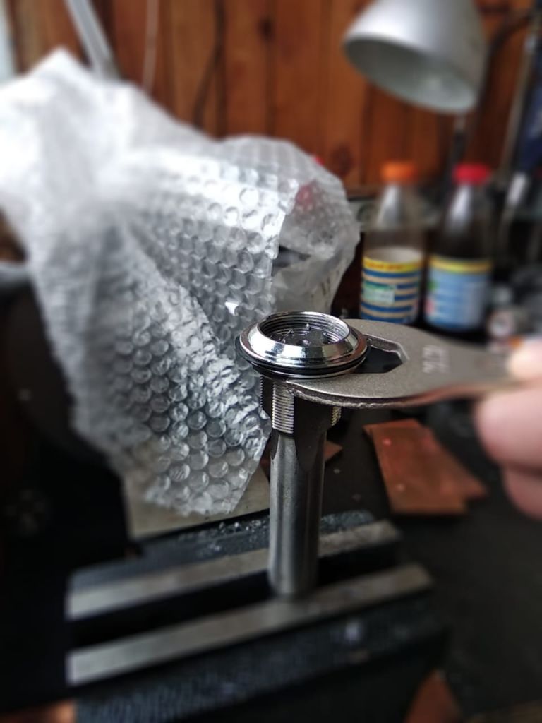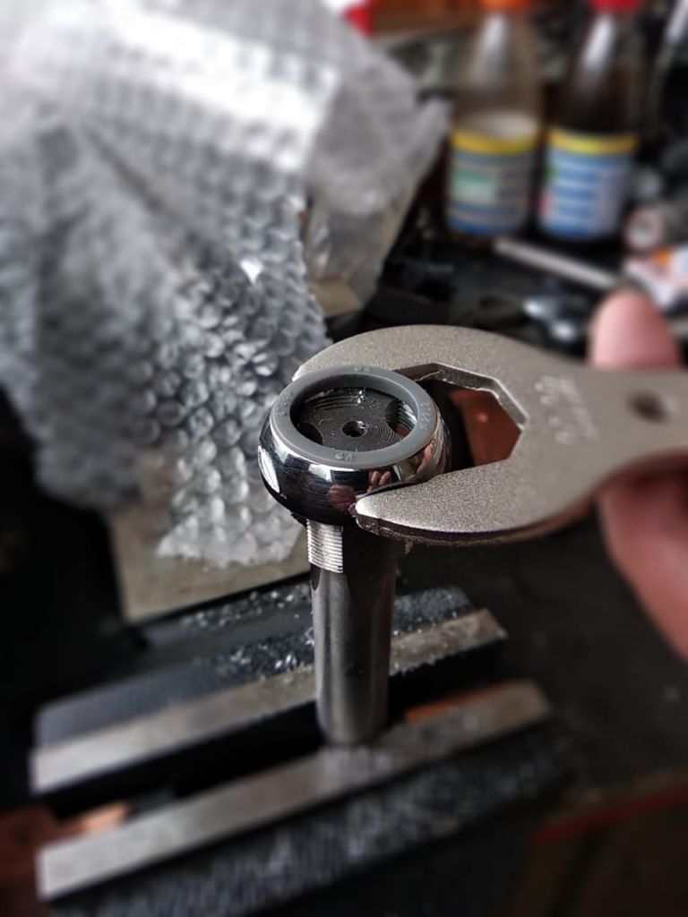 Чтобы с размаху не резать шток для возможности полной посадки контргайки, можно взять её от старого складного — она сверху не имеет завальцовки, и её можно накрутить на шток хоть на всю ЕГО резьбу. Или разделать хоть напильником не очень нужную контргайку сверху, чтоб там резьба проходила, и гайка не упиралась в край штока.