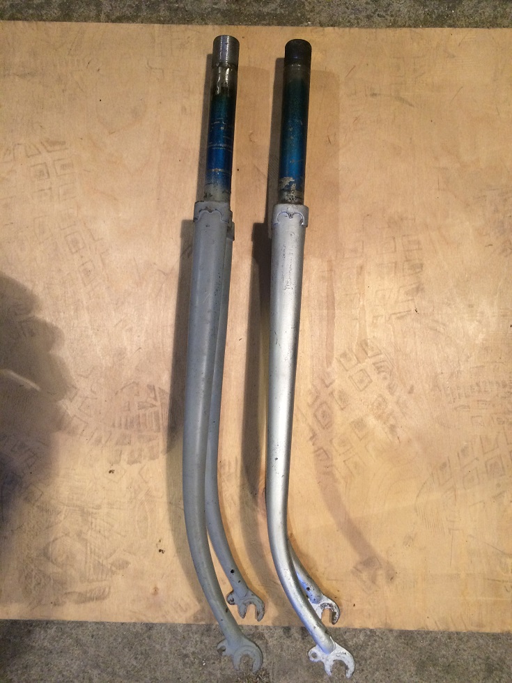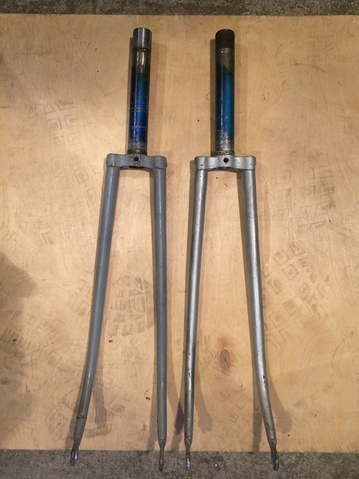 У вилки 69г более крутой изгиб перьев и левое перо на 1мм толще правого, у неё же усиление сделано как на вилке Туриста, на фото это хорошо видно. Далее хохма в том, что у вилки 77г усиление выполнено куском цельной трубы впаянной в основную. Если посмотреть со стороны резьбы, то хорошо видно ступеньку — начало вставки. И да, эта вилка будет "сотрудничать" с буржуйской  гарнитурой. Резьба на ней была испорченной, в металлоприемке была найдена вилка донор резьбы. Попытка приварить  патрубок аргоном оказалась неудачной. Все делалось по инструкции, сначала 4 точки, при этом текстолитовая вставка нещадно дымила, далее обварка по кругу, вышло криво.   Следующую попытку выполнял кузовщик полуавтоматом — варил точками с перерывами на охлаждение каждой точки. В качестве кондуктора применен вынос от неизвестного велика с помойки. Для устранения люфтов применялась фольга. Получил вилку уже в обточенном виде, проверил — не бьёт.  Надеюсь, кому-то этот опыт будет полезен.