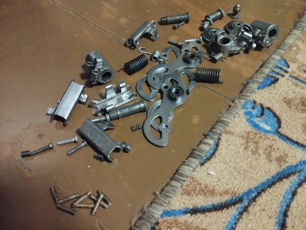 било пара перекидок, одна комплектная ,вторая не совсем,разобрал их, промыл от масла и песка(ролики не трогал,пока) ,теперь img/bw как я это соберу без токарного, оси латунные и болт(которым перекидка крепиться к раме)новые что бы изготовить ибо люфты... ( за Дятька Максима згадав, як він в такому випадку говорив).