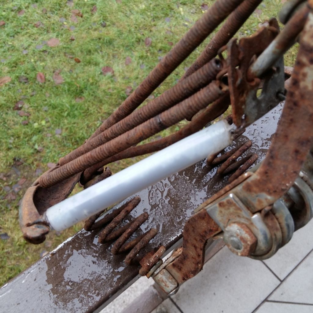 Залил внутрь из пистолета сантехнический силикон и засунул пружину от седла. Подождал, пока силикон застыл.