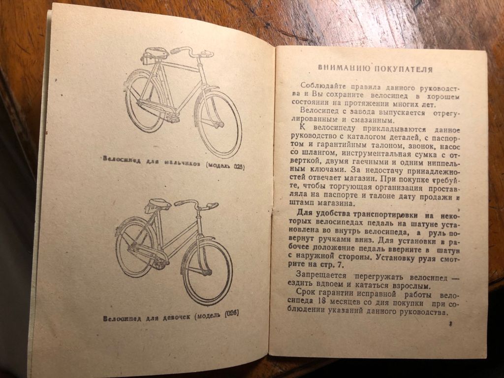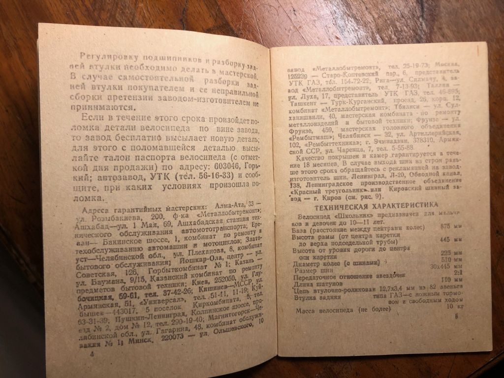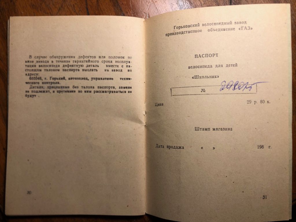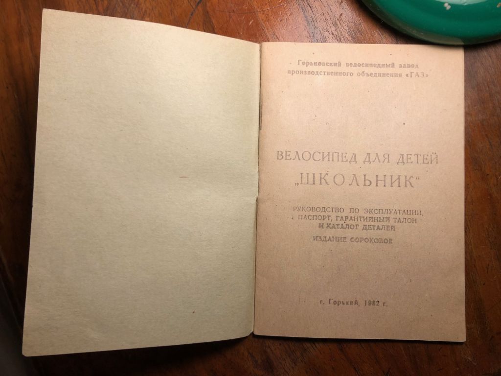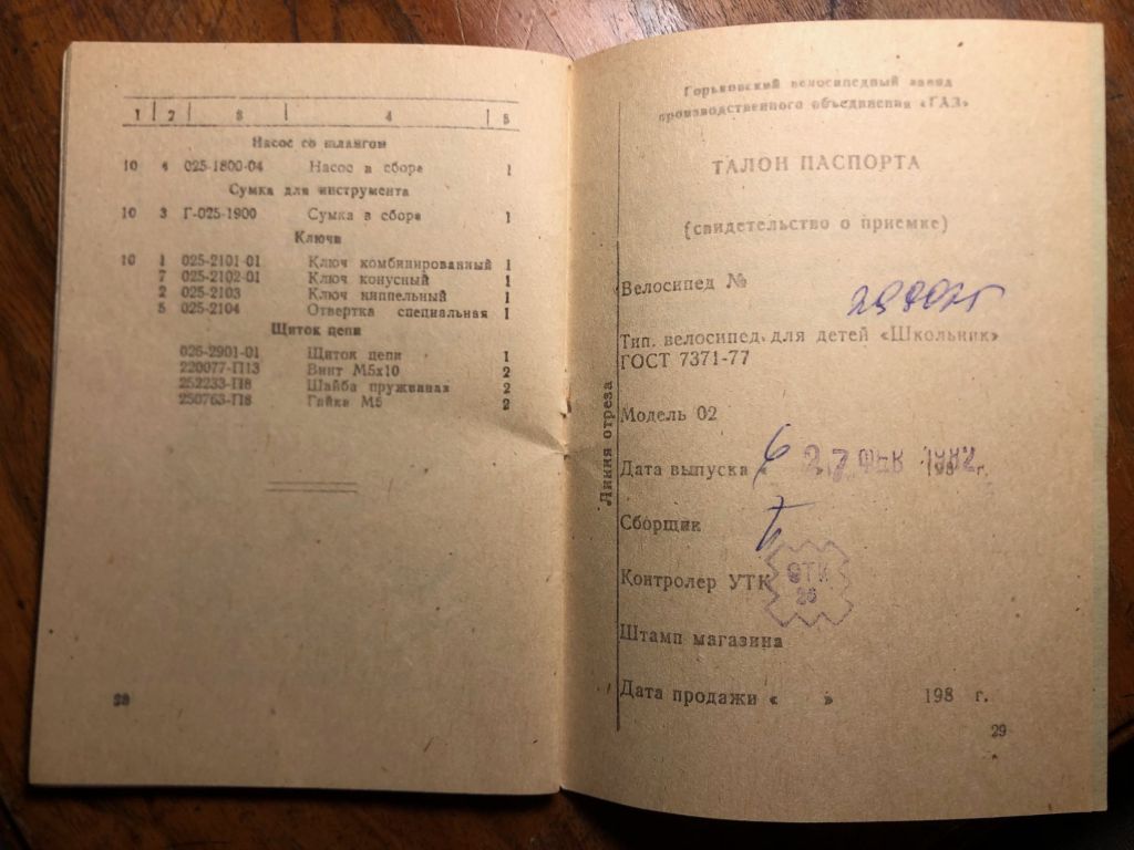 Инструкция по эксплуатации 1982 года, с паспортом, выданным в конце февраля велосипеду с близким к моему номером камы (282 тысяча против 298-ой). Так как газовская нумерация пока покрыта мраком, утверждать, что мой велосипед 1982 г, пока не возможно.