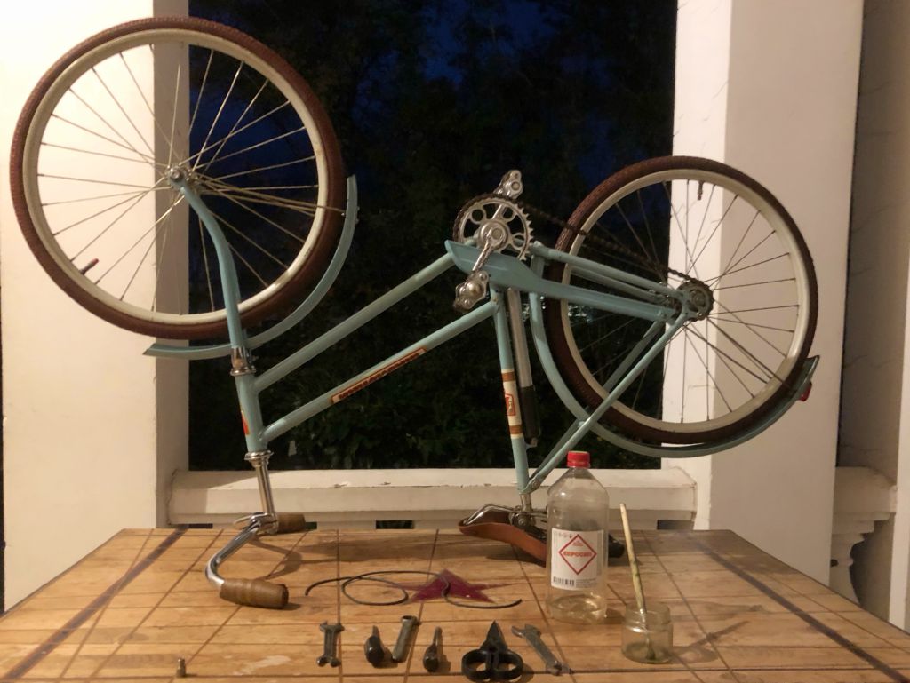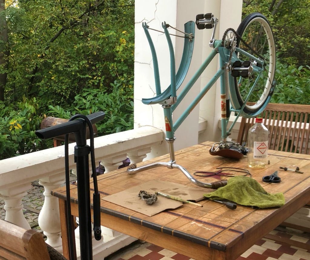 Осталось нанести красные цировки на заднее колесо, заменить шины на красноватые и доукомплектовать велосумочку. Звонок с малым хомутом уже найден.