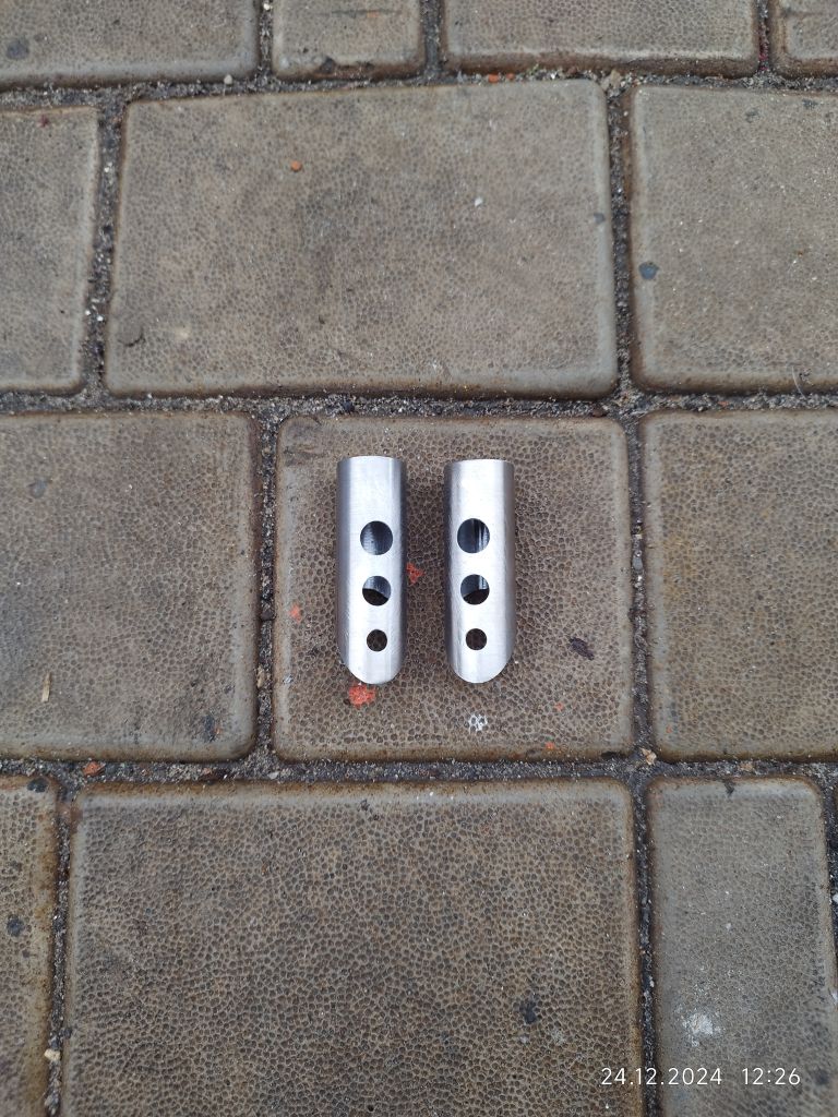 Поэтому решил сделать с накладками. Был найден в закромах кусок трубы, с более-менее подходящим внутренним диаметром и сделаны вот такие накладочки