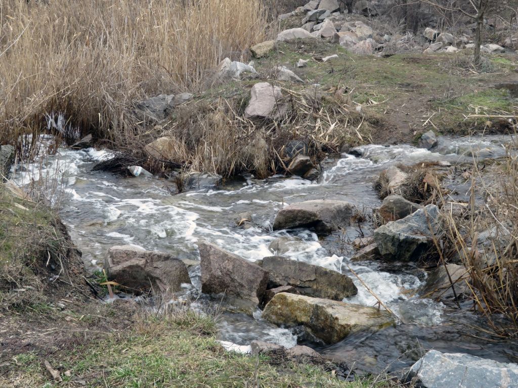 Спустившись в низ увидел, что это маленький ручей пробивается через гранит.