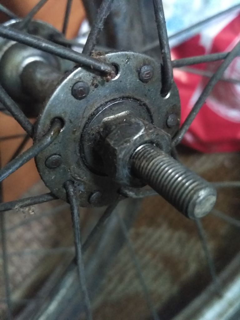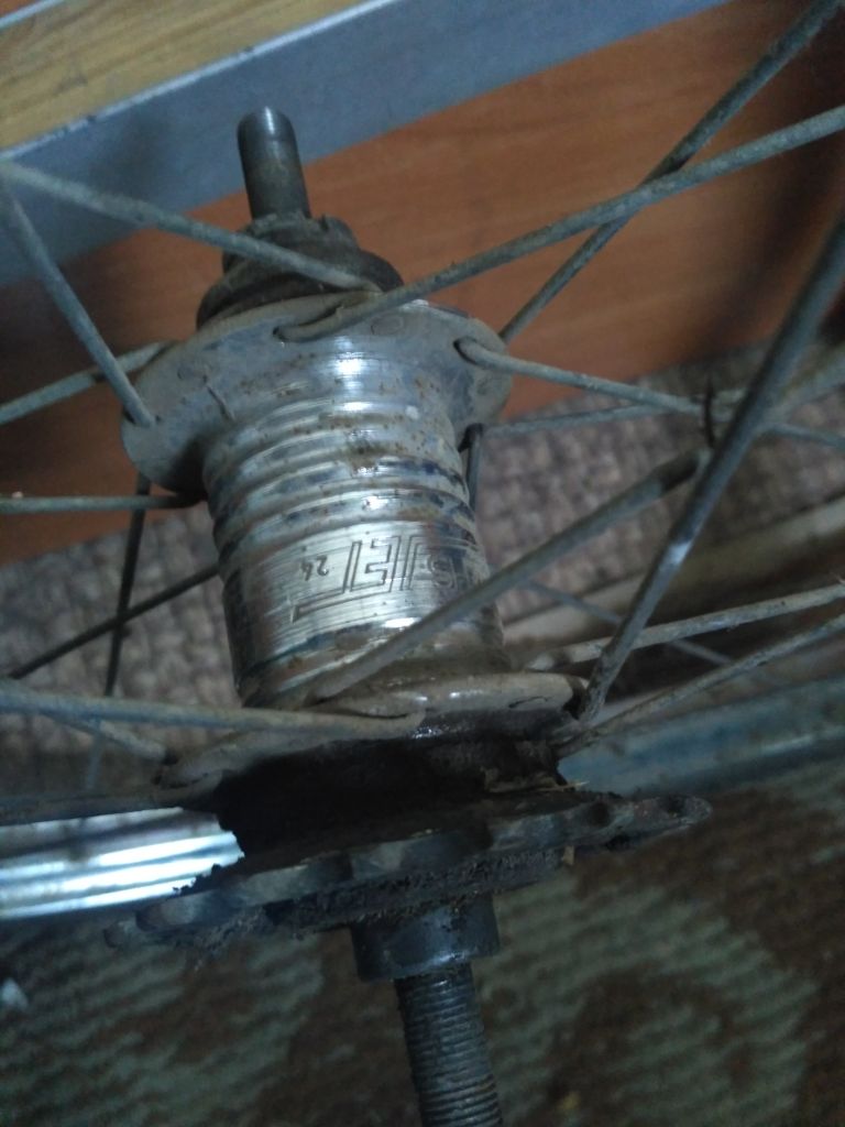 Колёса те размера нашего Школьника примерно, даже по количеству спиц. И по шинам там какой-то дурацкий размер — не удивлюсь если такой точно. Передняя втулка галимая дешевка по-европейски экономная. Частая гримаса приехавших оттуда дорожных велов — нечто вкусное сзади и вот такое спереди. Часто даже оцинкованное, а не хромированное.