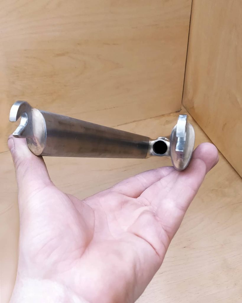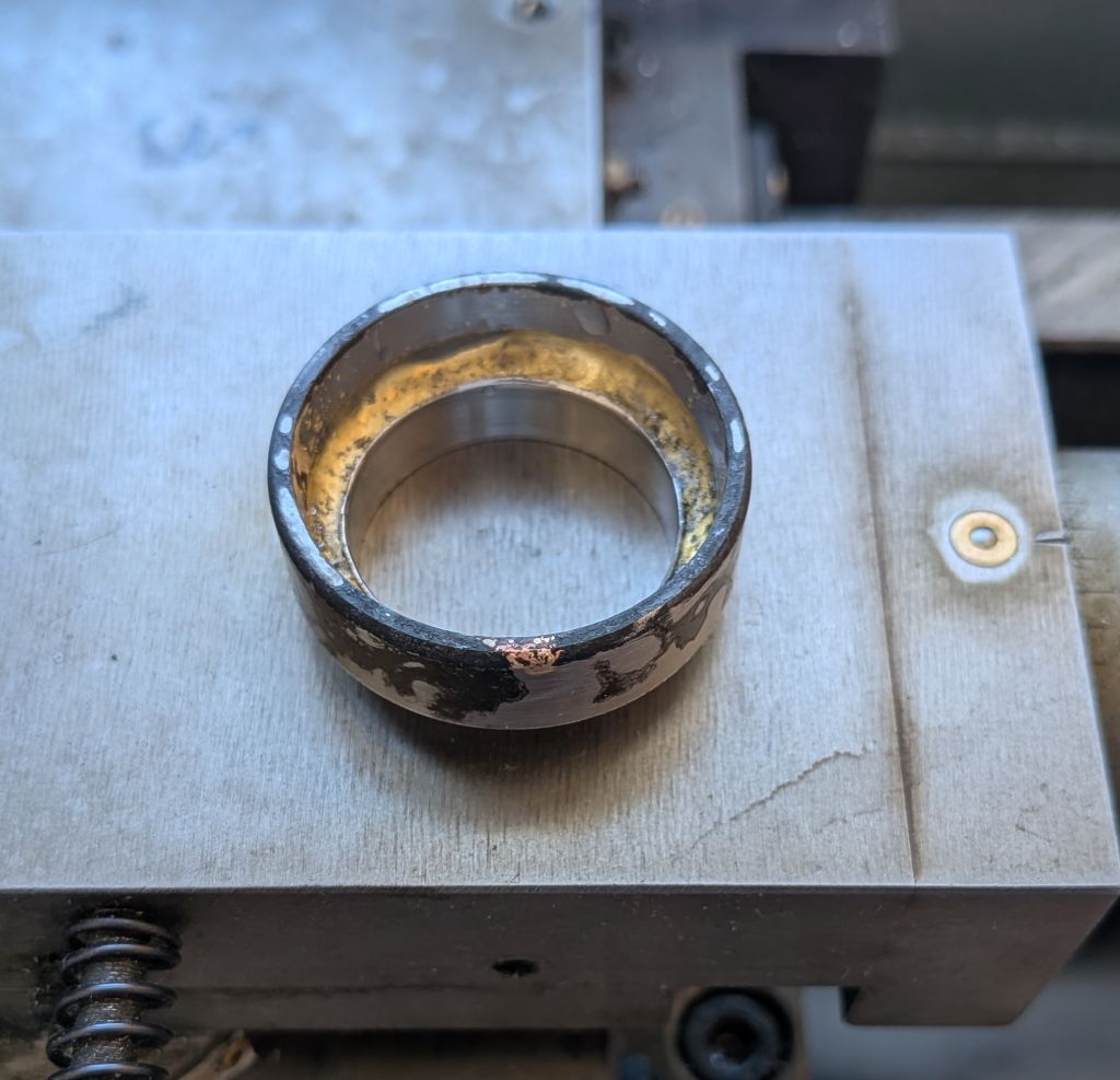 Чашка сделана из двух частей, спаянных вместе. Половина внутреннего кольца пошла на конус, а вторая -- на часть чашки, что будет впрессована в рулевой стакан.