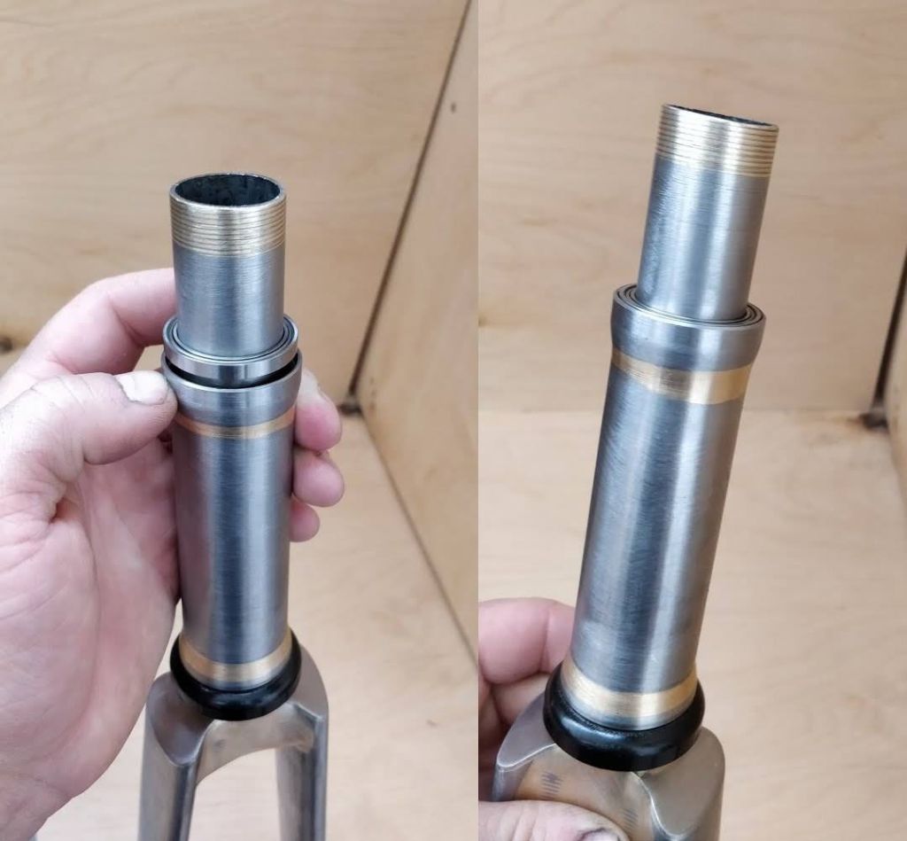 Шток columbus несколько модифицирован. Верхняя часть проточена до 25мм, чтобы садился стандартный подшипник 25x32
