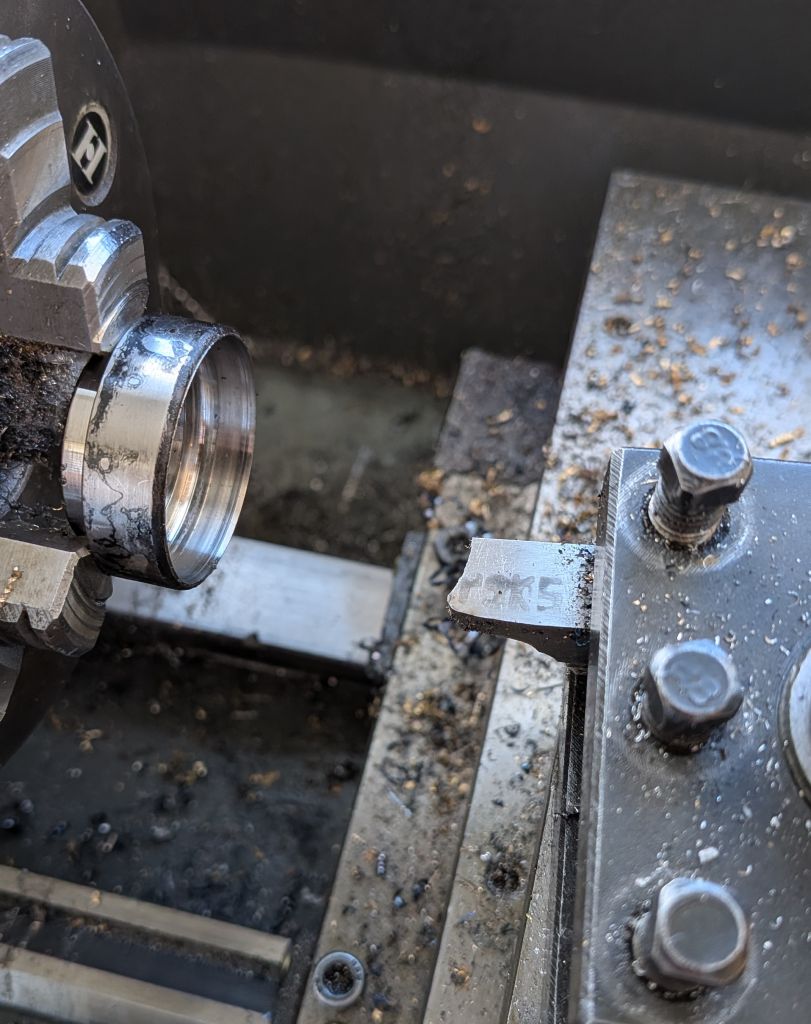 У меня патрон довольно точный, так что для целей рулевой я могу просто закрепить в кулачках чашку за только что проточенную посадку. Насколько это возможно, протачиваю внутренний диаметр расточным резцом. Для дорожки заточил кусок быстрореза по форме, которую считал подходящей. Снимал совсем немного материала за один проход и делал перерывы, чтобы заготовка остыла (СОЖ? нет СОЖ  img/ak ).