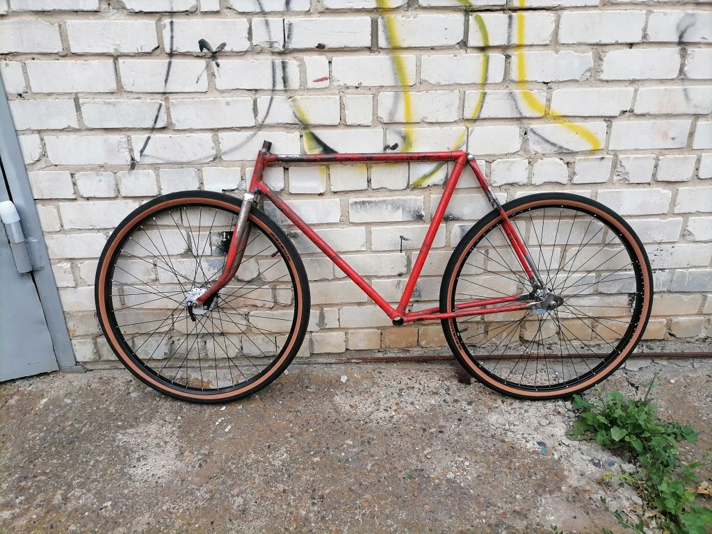 Всё было выпрямлено, расплющенная часть выпилена, вместо неё вварена подходящая трубка. Мелкие вмятины на раме устранять не стал, решил, что колеса красивые, будут отвлекать.