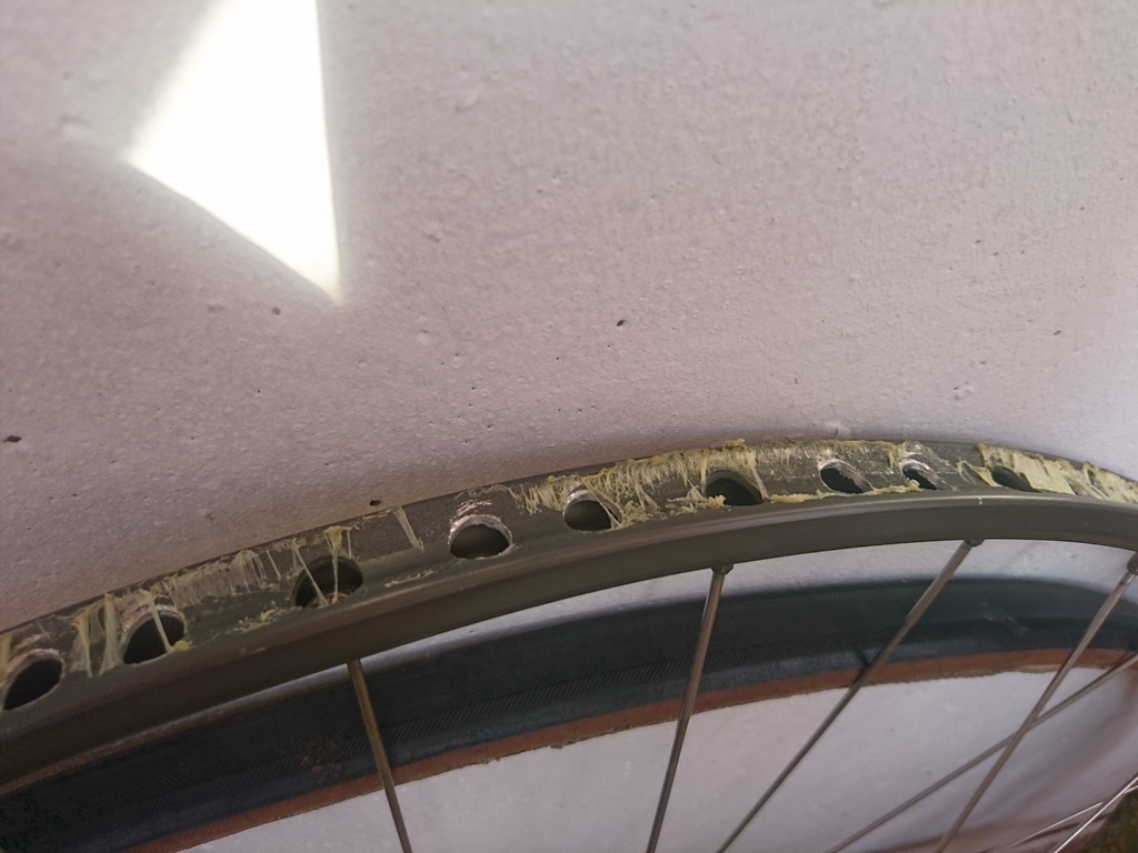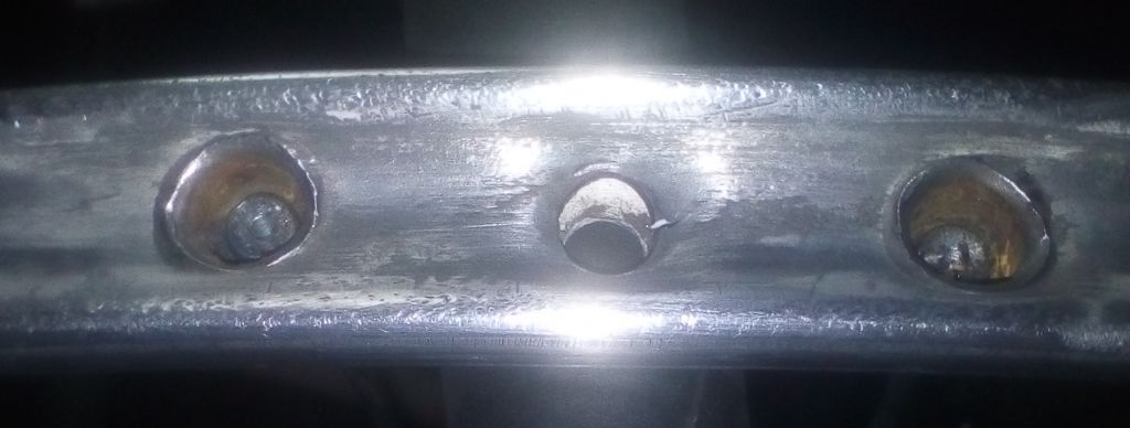 Подогнал, или точнее подогнул отверстие ниппеля в ободе. Использовал колпачковую гайку, под ключ на 10-ть, накрученную на шпильку. Обод повесил на деревянный поручень, подложив предварительно сложенную в восемь слоёв джинсу, и постукивая молотком пошпильке, гайкой придал необходимую "конусность" отверстию ниппеля. Сильно не усердствовал, т.как отверстие имеет трещину, осаживал пока грани гайки не коснулись боковин обода. Теперь трубка садиться вполне культурно.