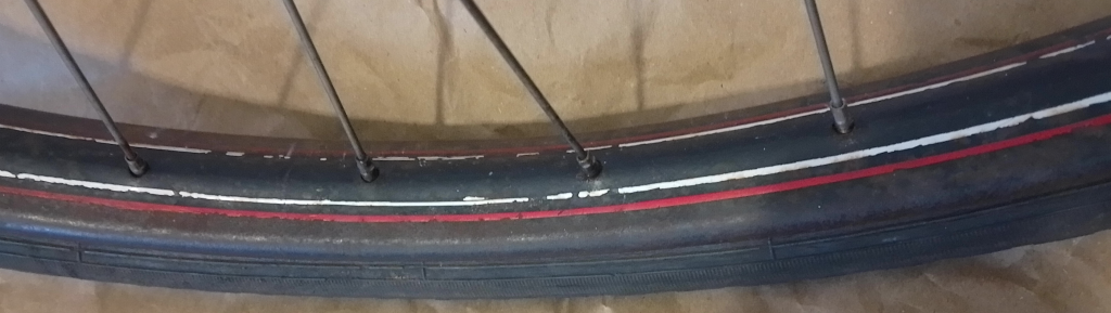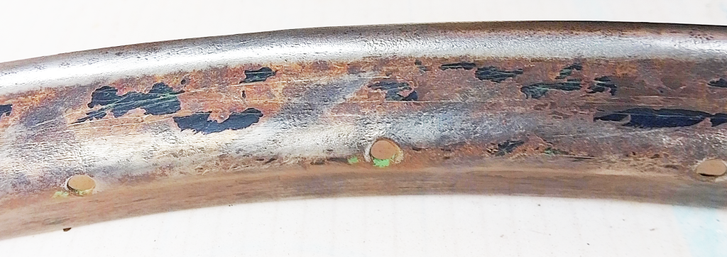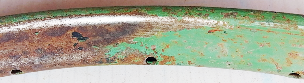 Як писав у #3, обод передній 28" під 32 спиці, "чайка", фарбований у чорний, з біло-червоними ліновками. Біла лінія – внутрішня, червона – зовнішня, тобто відповідає #7. Стан покриття обода міг би бути кращим, буду вважати задовільним і залишу без перефарбування. На фото: найкраще й найгірше збережені частини фарбування.