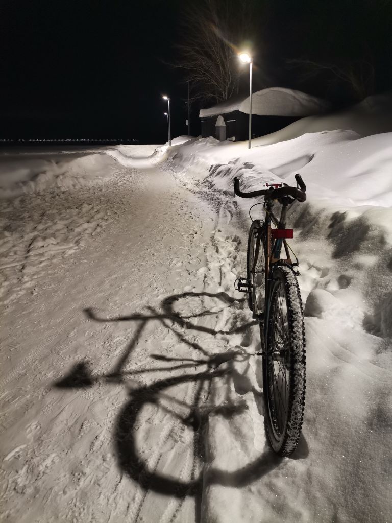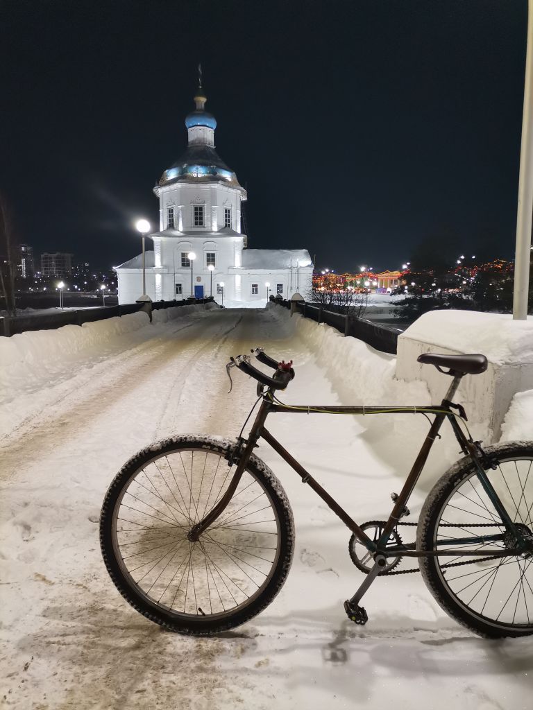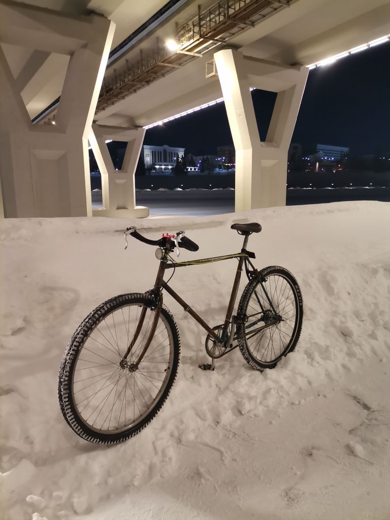 Сегодня выкатил на работу на велосипеде. Прогноз был на -6/-8°С, оказалось -16 на таблоиде у проходной. Маршрут 7,5 км до работы, по крутому спуску и небольшому подъему около 4 км.