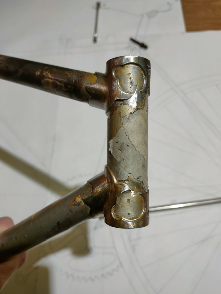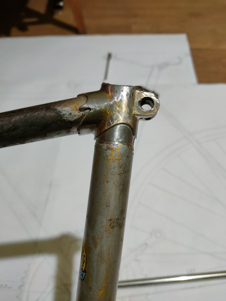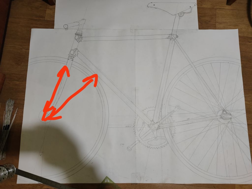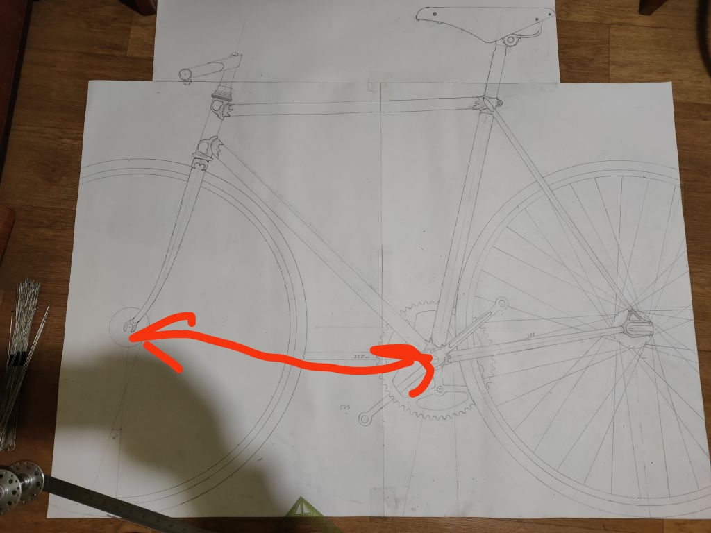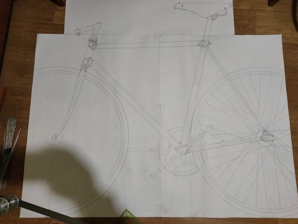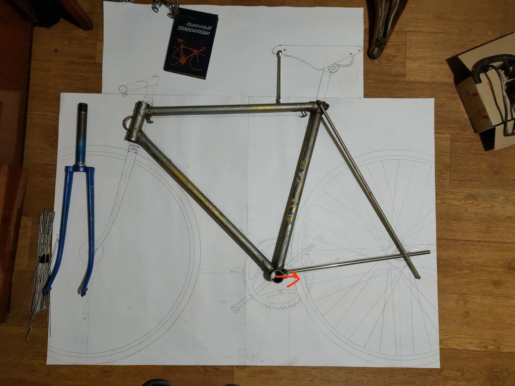 Но примерки то я делал с задним треугольником, а с ним тяжелее понять совпадение эскизу. После того как отрезал задний треугольник, понял что я не попадаю в свой эскиз. Длины нижней трубы все равно не достаточно, прийдется еще сильнее укорачивать переднюю полубазу из-за чего появляется оверлап. Нужны будут шатуны 165мм, буду укорачивать хвз. И получается сильнее назад будет завалена труба подседела, плюс чтобы полностью не переделывать всю раму, решил оставить 56ю ростовку, получив более выраженный наклон трубы, привет современным фиксам). Но облегчаю себе задачу, переделать останется только задний треугольник.