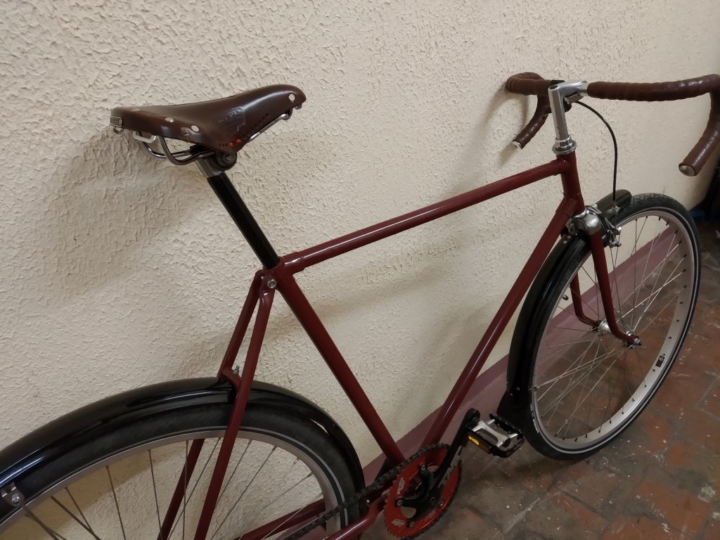За основу взят дорожник "Украина" В-120 (рама, вилка и рулевая колонка). Порошок по RAL 3005 с лёгким блеском в лаке. Колёса и обвес новые из того, что оказалось под рукой. Стальной руль с тяжелого туринга. Вес 13,6. Сегодня обкатал, мне понравилось.