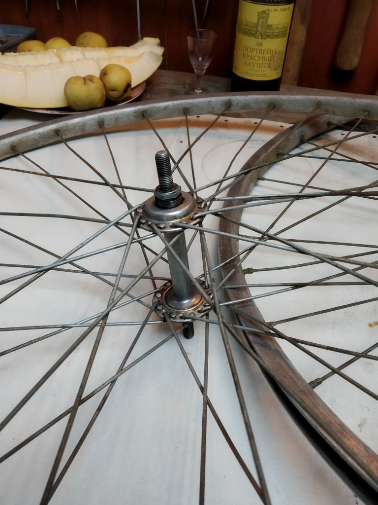 Втулки оказались с дюралевыми фланцами, посадочная ширина ободов 17 мм, покрышка ГОСТа 52-го года.. img/bw
