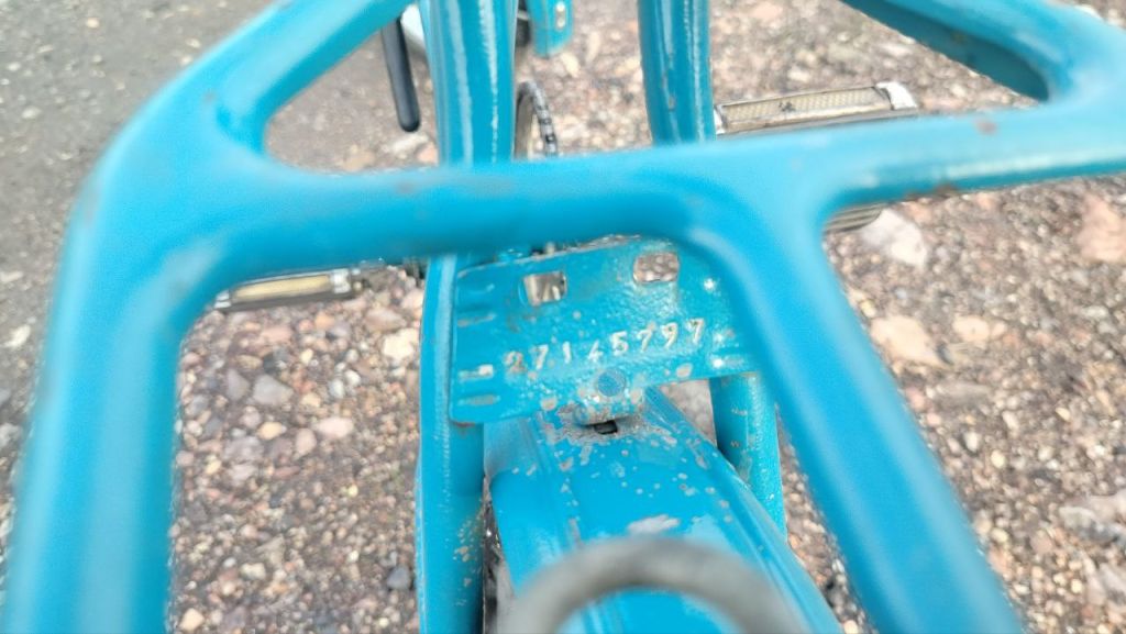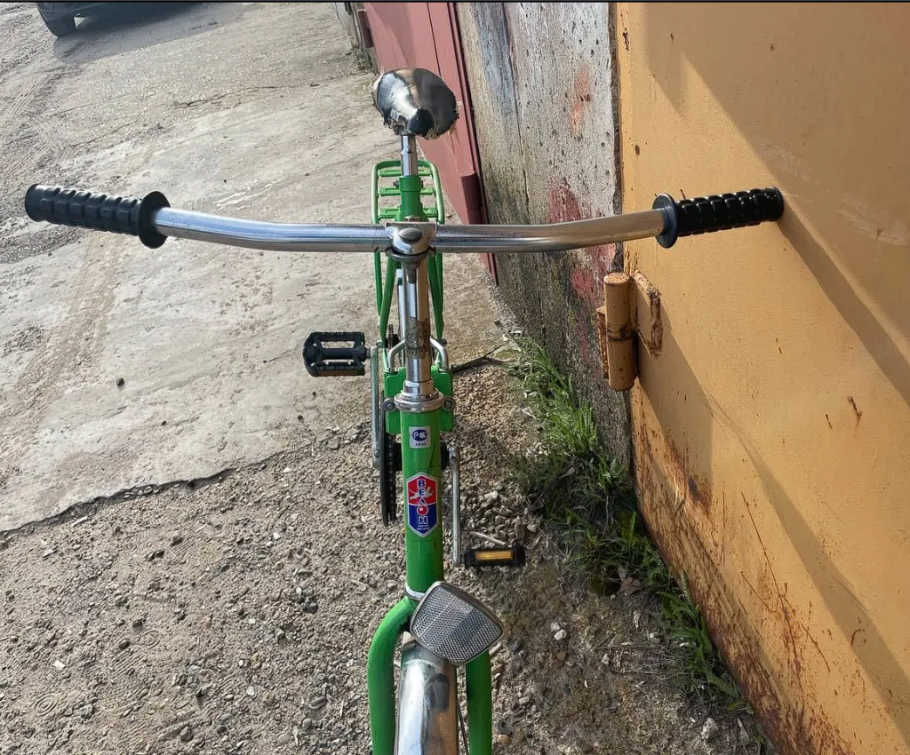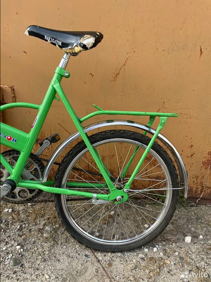 велосипед полностью в родной комплектации за исключением седла. крылья и обода, втулки, спицы шатуны и так далее крашены каким то "умельцем" из баллончика. хотя в оригинале там оцинковка, а не хром.