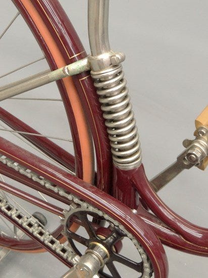 Подвеска седла, дюймовая цепь. Рудименты "пауков" — регулируемая длина шатунов, конструкция колёс (жёсткие шины, радиальный набор, толстые спицы вкручены во фланцы). Стартовая подножка — пег слева заднего колеса. Подножки "холостого хода" на вилке — ведь это фикс.