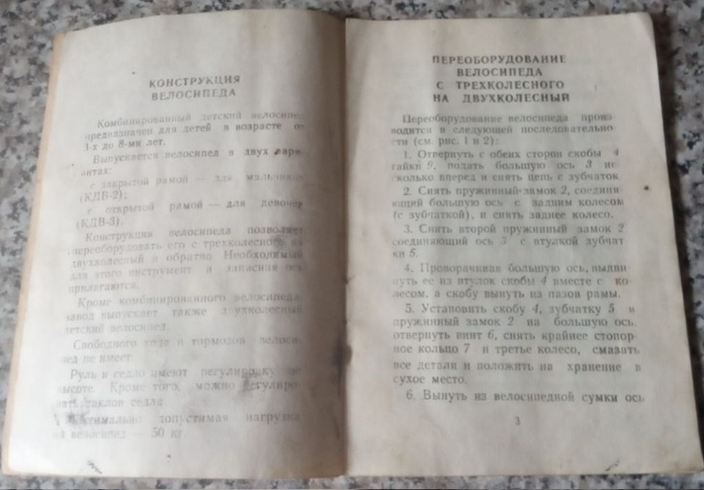Комбинированный детский велосипед КДВ-2. Паспорт и инструкция (1970)