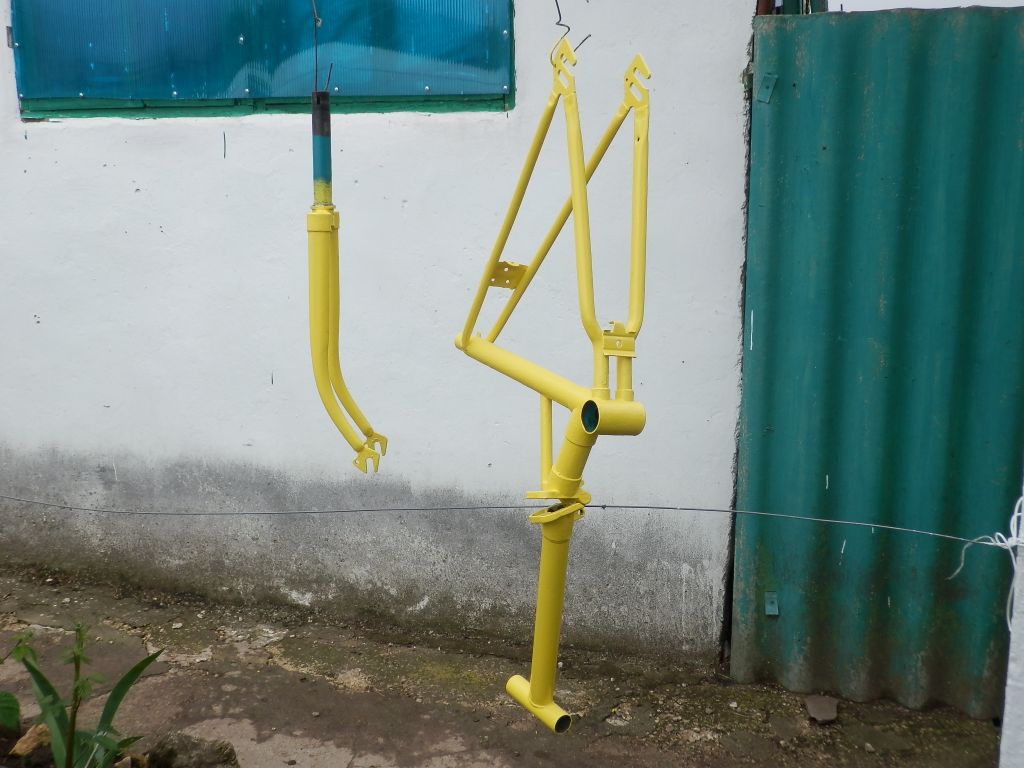 Уважаемый Пафнутий,рулевая на веле стоит ровно,-это искажение на фото,а тонкая трубка приварена для усиления основной трубы и образует ферму,устойчивую к повышенным нагрузкам в вертикальной плоскости т.к основная труба сделана из тонкостенной нержавейки.