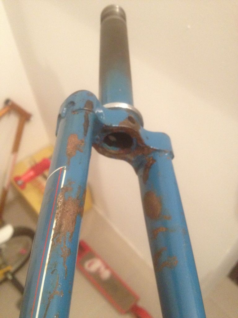 Ржавчина на вилке поверхностная по виду. Протереть автокосметикой и так оставить. Так оно надолго и останется, если вел специально на улице не хранить.