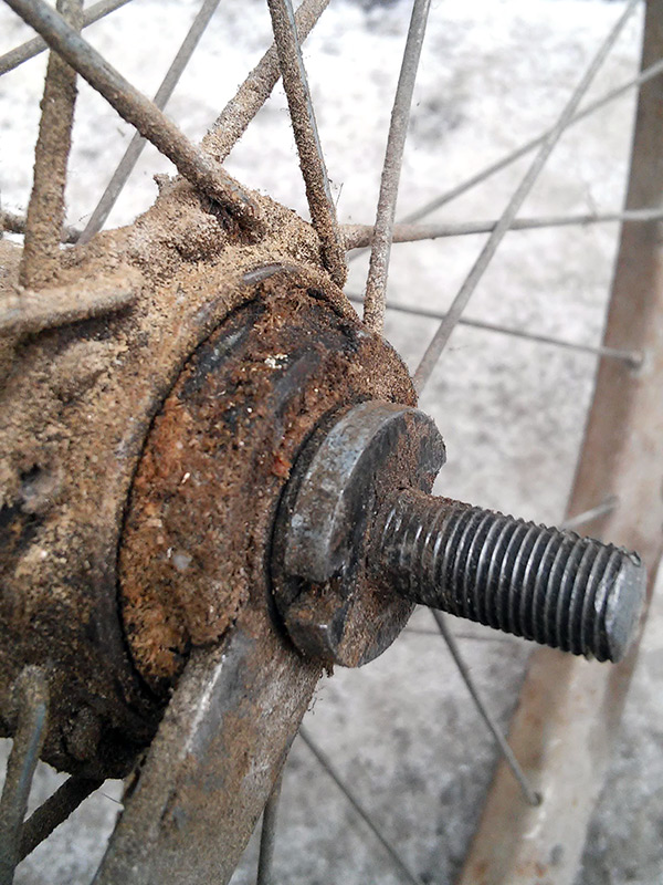 Заднее колесо: обод ржавый и гнутый, торпедо с маслёнкой, толстой контргайкой и креплением звезды с помощью локринга, спицы все, ровные, с латунными ниппелями, все открутились без проблем. На втулке отличный защитный гряземасляный слой, обычно под таким хорошо сохраняется хром (еще не отмывал).
