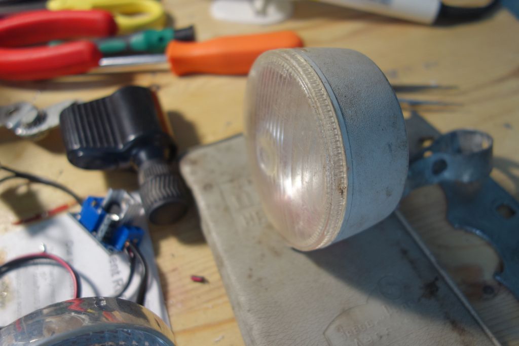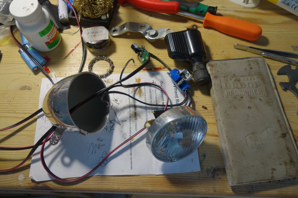 Динамофары и динамка. На динамке надпись Germany и логотип FER. Фары советская и китайская, купленная несколько лет назад. Сейчас переделываю на постоянное напряжение, т.к. нужен свет поярче и новые лампы на "переменку" сложно достать, плюс с постоянным проще работать.