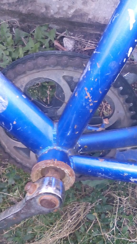 Несмотря на то, что на этот металлолом без слез не глянешь, он очень легко и уверенно едет, рама на 3-4 см длиннее того на чем я щас езжу (неведома зверушка, под названием салют, куплен лет десять назад на рынке) и по росту норм. Делать собирался штоп возить свою жопу ну и когда-никогда десяток кг груза на дачу и по месту. Планировал поменять ось с подшипниками, решил попытать ума как бы все сделать правильно. Теперь вот вообще не знаю чо делать с этой рамой — выкинуть жалко, а восстановить в исходное гемор немалый.