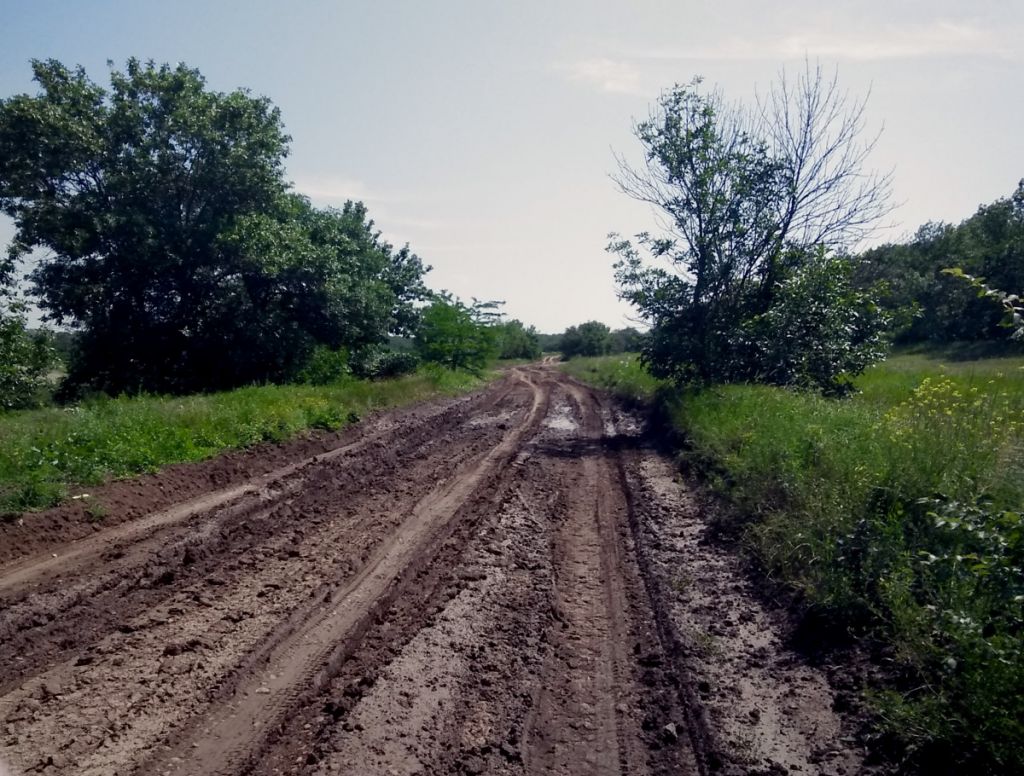 Вот там я и влип. Мокрая липучая глина налипла на колеса, забилась под крылья, налипла на перьях – жесть полная! Кое-как выбрался, нашел какую-то палку, прочистил налипшее на перьях и крыльях, чтоб ехать было можно (а с колес оно в процессе движения само поотлетало).