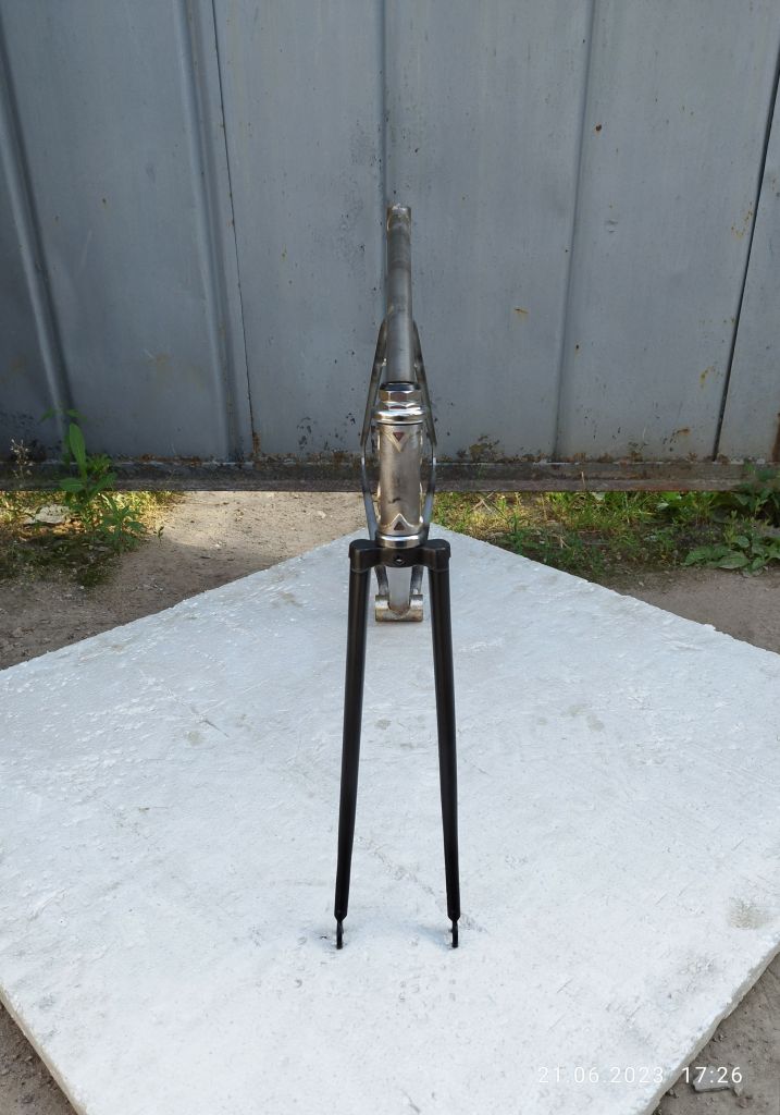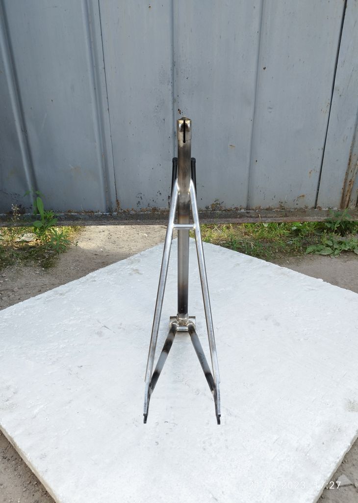 Старый рулевой стакан, кусок подседельной, верхней трубы и перья были высверлены на фрезерном, убрана хохлома, бонки, крепления насоса и запаяны на их местах вмятины.