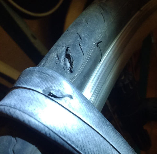 Сегодня я умудрился опять проколоться, притом весьма жестко  img/ac  Не яма, не "змеиный укус" — на ровном месте наехал на что-то острое (так и не нашел, на что — хотел убрать с дороги), и задняя шина громко сказала "Пффшш!!" — воздух вышел весь и сразу. Осмотр показал серьёзный прорез покрышки и камеры. Запасная камера была, поменял и накачал атмосферы две-три, т.к. боялся, что под нормальным давлением дыра в покрышке увеличится. Кое-как не спеша доехал.