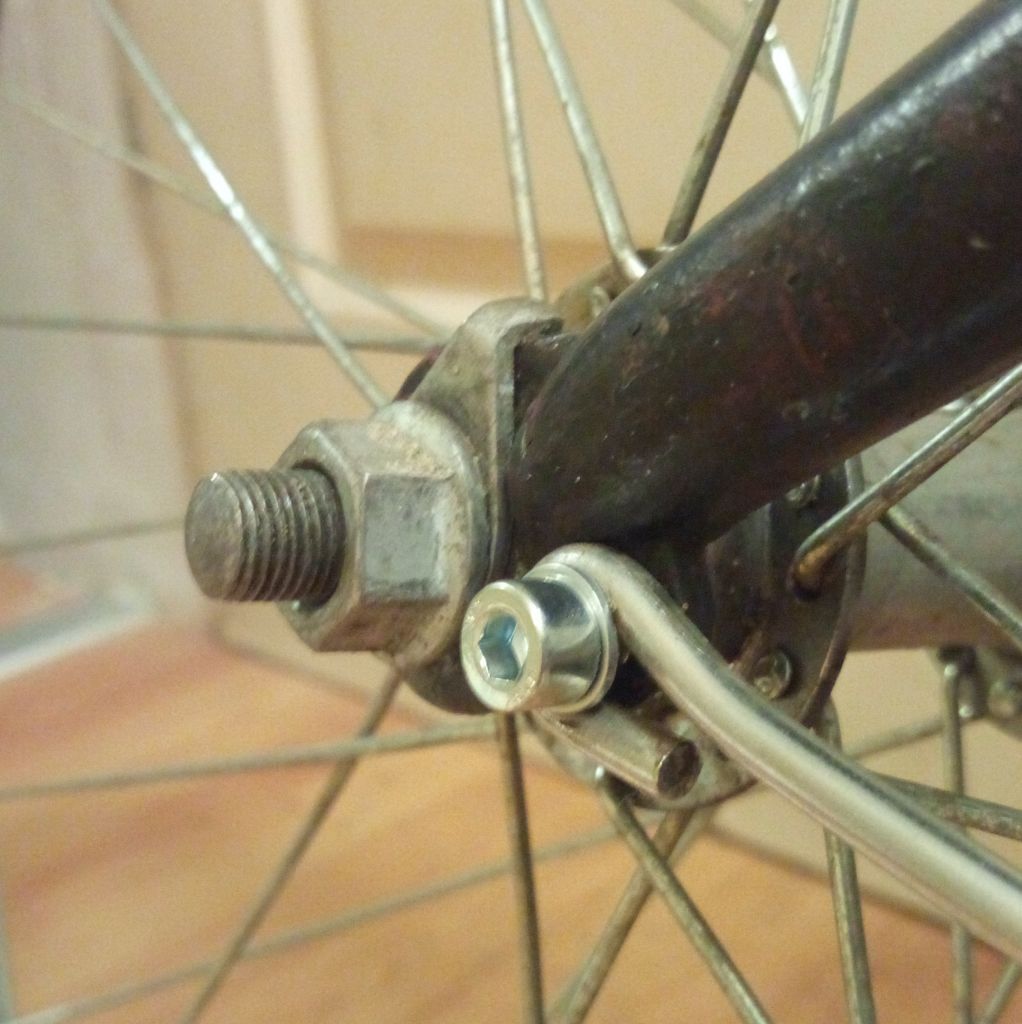 Колпачковые гайки — это и безопасно, и красиво, и защита резьбы от воды и песка, но... вот у этих форма какая-то неудачная. Не смотрится. На переднем тормозе Горца у единственной сохранившейся родной гайки колпачок сферический, и выглядит она по феншую. А поставил рядом эти вытянутые — ну не нравится, и всё тут. Буду искать, чем заменить.