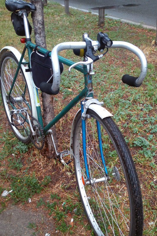 Примерил на Джанго еще один руль — по форме обычный дорожный, но алюминиевый. Вот он пока удобнее всего, что пробовал, тольо грипсов на 24 мм у меня нет. А баран мне тут не нужен, вел же не гоночный, а чисто разъездной. Только вынос надо покороче, стартоновский для этой рамы длинноват. Рубашка тросика переднего тормоза оказалась коротковата для нормального расположения ручки, пришлось тросик менять на более длинный. И всё-таки ручка просится влево — справа таки непривычно. А может, и второй тормоз верну — этот руль позволяет.