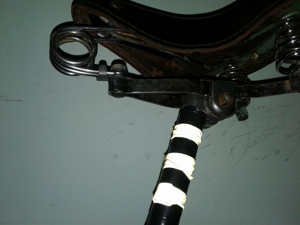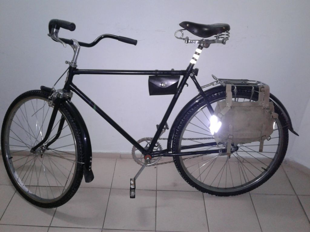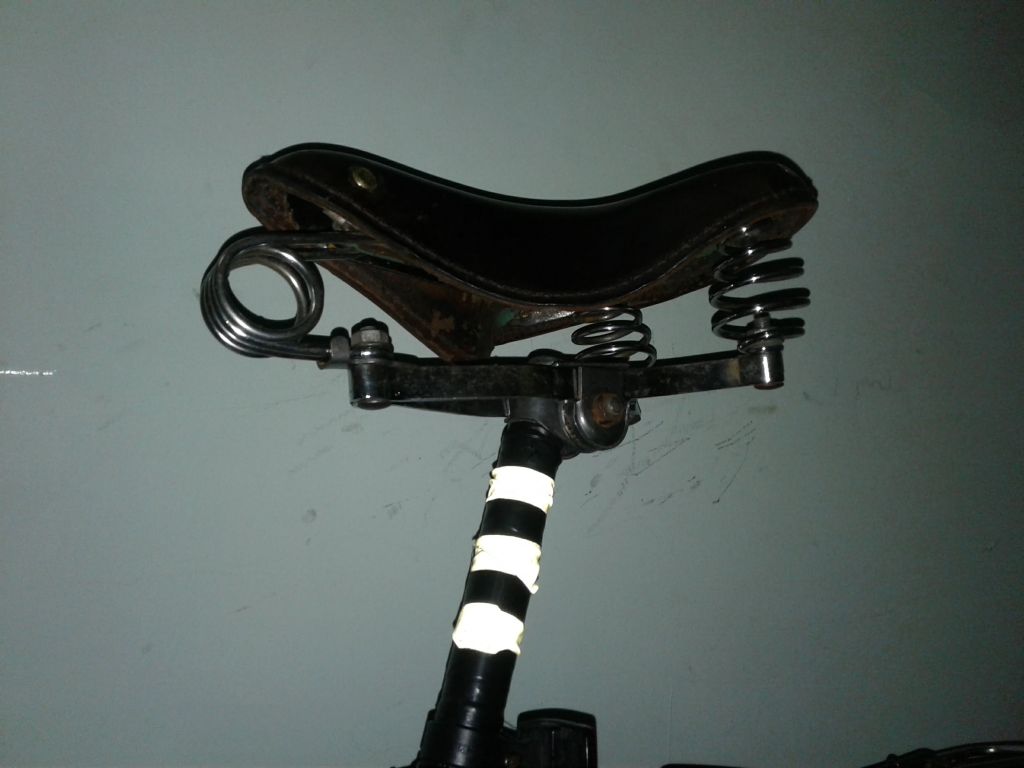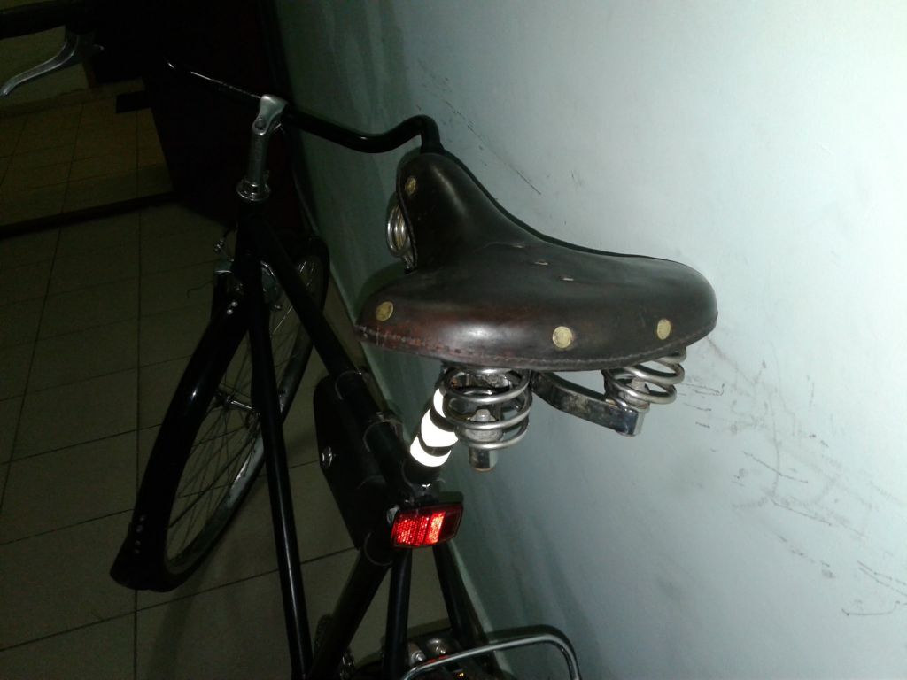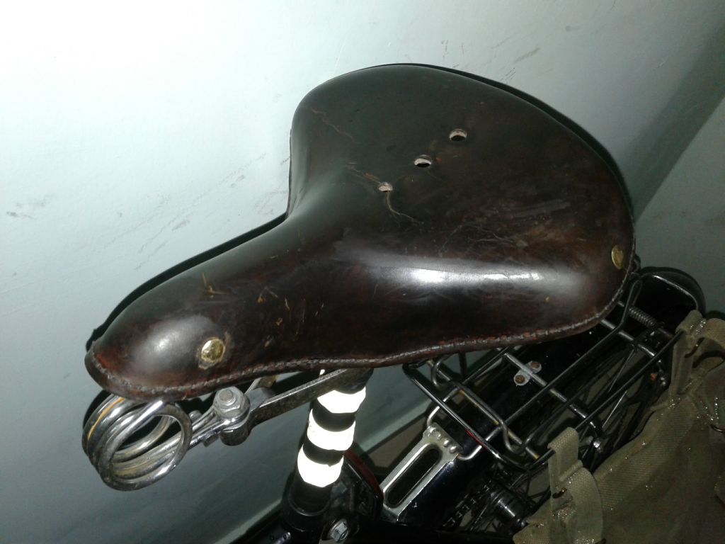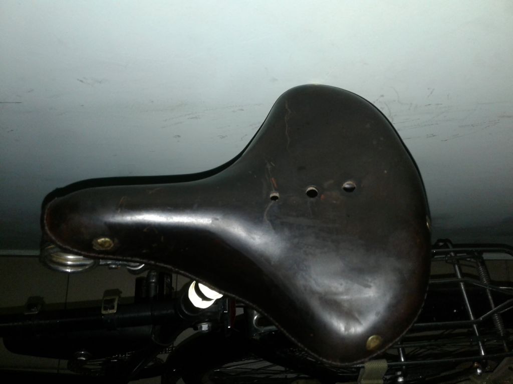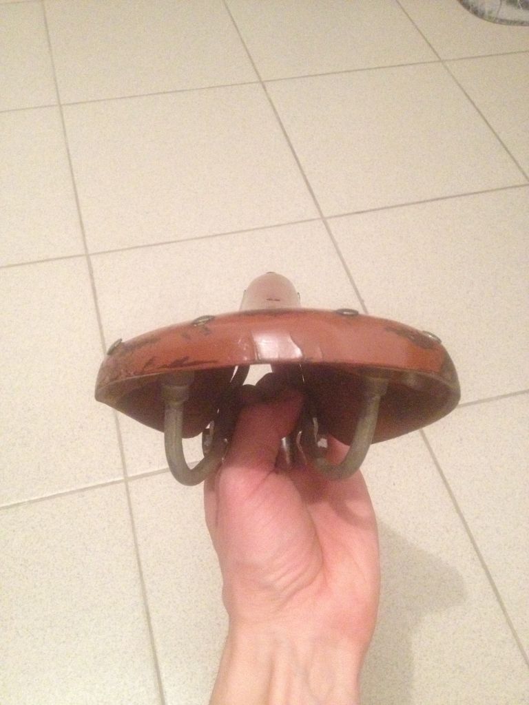 У меня на минске навернулось родное сиденье(выломалась скоба, которая держит подседельную дугу). Решил вопрос кардинально. Из трех седел собрал каркас с кипятильником, кожу думал поставить от минского двухпружинного седла. Замочил в желатине, высушил на основе, немного наждачки , покраска краской для кожи( с куреневского рынка), и обработал восковым кремом для обуви. Но в кладовке валялся черпак от седла с кипятильником. Когдато нашел его у деда в сарае в ящике( практически все запчасти я выгреб, черпак не брал ввиду его на тот момент невостребованости и состояния). Черпак я забрал чисто из-за "щоб було". Он был грязный, с облезлой красной краской, в плесени и пр. прелестях лежания не одну зиму в ящике без дна, на голой земле. Решил я этот черпак попробовать поставить. Для начала отмыл. Твердость оказалась такой, что в желатине решил не замачивать. Трещины были, но я не сильно обращал на них внимание, т.к. решил сделать седло на скорую руку, чисто для опыта. Забыл сказать, черпак был расслоен, нижняя часть отклеена от верха. Проклеил моментом, прошил по краю. Потом полирнул наждачкой (куски красной краски сниматься по другому не хотели) и в несколько приемов, за несколько дней покрасил и просушил. Кожа получилась неоднороднео покрашена, были пятна какойто гадости, которые кожу будто бы выжгли (наждачка не сильно помогла). В итоге покрыл кожу горячим воском в несколько приемов и полирнул. Черпак приклепал к каркасу медными заклепками. Расклепано было халтурно,т.к. заклепки подходили по диаметру, но не по длине(пришлось резать и укорачивать). В итоге сегодня обкатал. Поезжу, посмотрю, как будет держаться восковое покрытие. Интересно, от какого вела черпак. Сбоку выдавлен круг, внутри которого перевернутый треугольник. В треугольнике ничего не вписано.