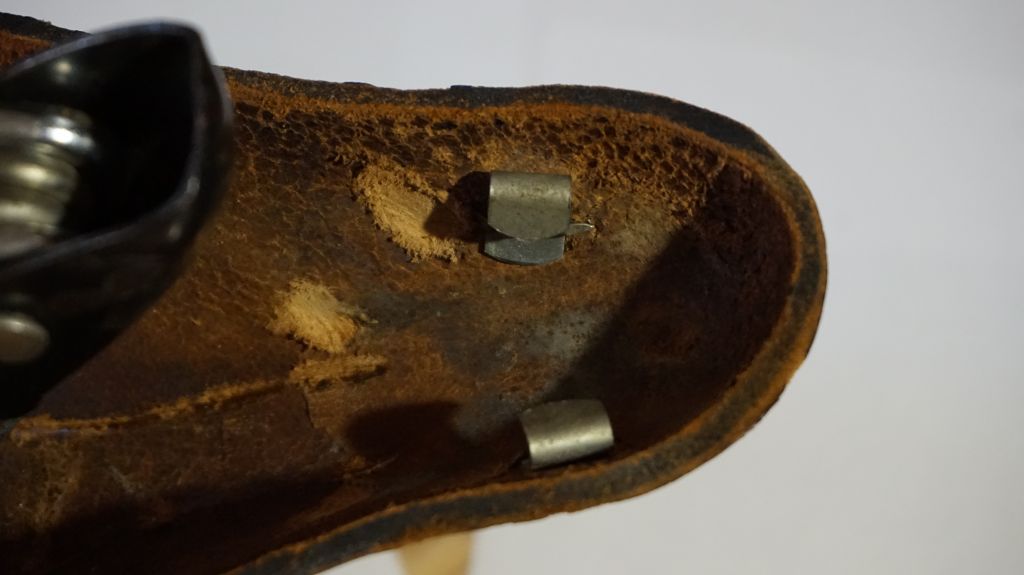 Где-то раньше в этой теме попадалось фото с надрывом у заклепки у носика. Так и оставлю на скользящей скобе. Кожа рыхловата, скорее всего и порвется, если жестко зафиксировать.