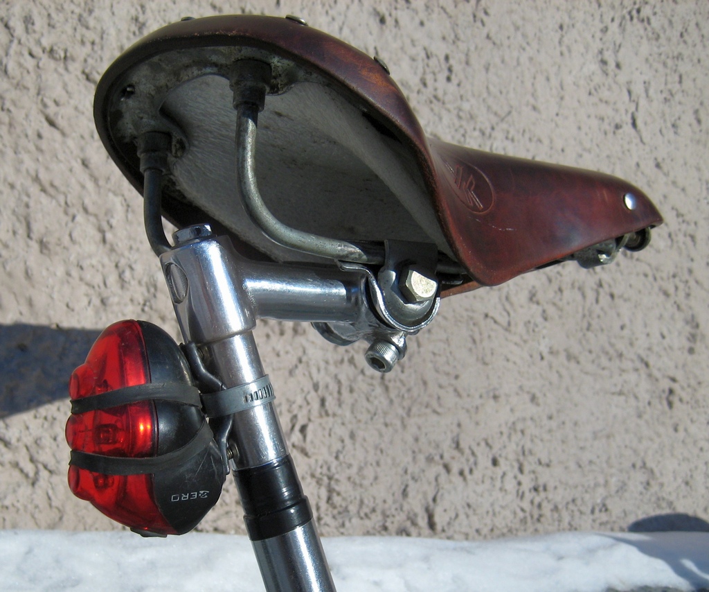 Кусок обычного строительного утеплителя, вырезанный по внутренней форме седла и вставленный в него. Ничем дополнительно не закреплён, держится, не выпадывает. Греет не сказать чтобы сильно, но уменьшает циркуляцию холодного воздуха под седлом, особенно при -15 и ниже. Заодно в оттепели предохраняет внутренность седла от мокрого снега и воды, летящих с колеса (полные крылья, конечно, спасли бы, но не люблю их).